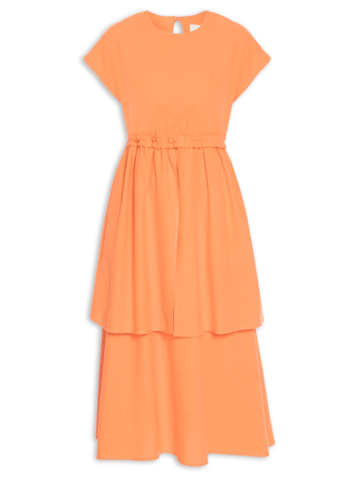 O vestido laranja é confeccionado em tecido leve. A peça possui decote redondo, detalhe franzido na altura da cintura, recorte vazado na parte posterior, babado em camada sobreposto, comprimento midi, shape solto, caimento reto, acabamento pespontado e fechamento posterior por botões.