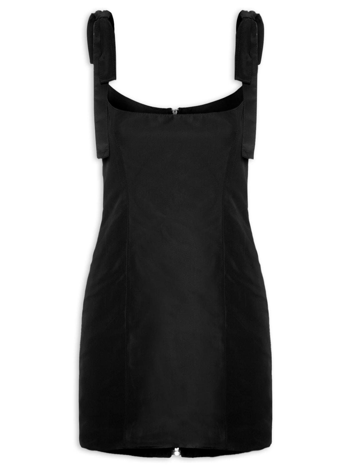 O vestido preto é confeccionado em tecido leve sem elasticidade. A peça justa ao corpo possui decote posterior e frontal quadrado, alças médias alongadas reguláveis por amarração, cavas regulares, recortes posteriores e frontais, sem bojo, forro, comprimento curto e fechamento posterior por zíper.