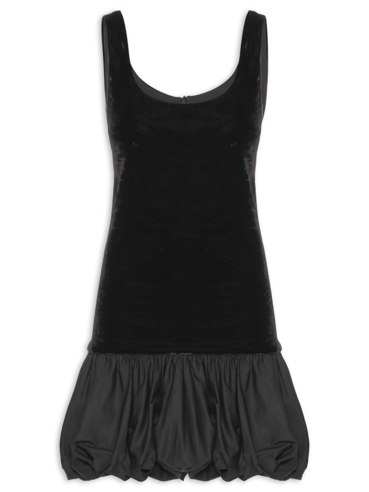 O vestido preto é confeccionado em suede com baixa elasticidade. A peça justa no busto e solta no comprimento possui decote quadrado, alças médias, cavas regulares, saia balonê, forro, comprimento curto e fechamento posterior por zíper invisível.
