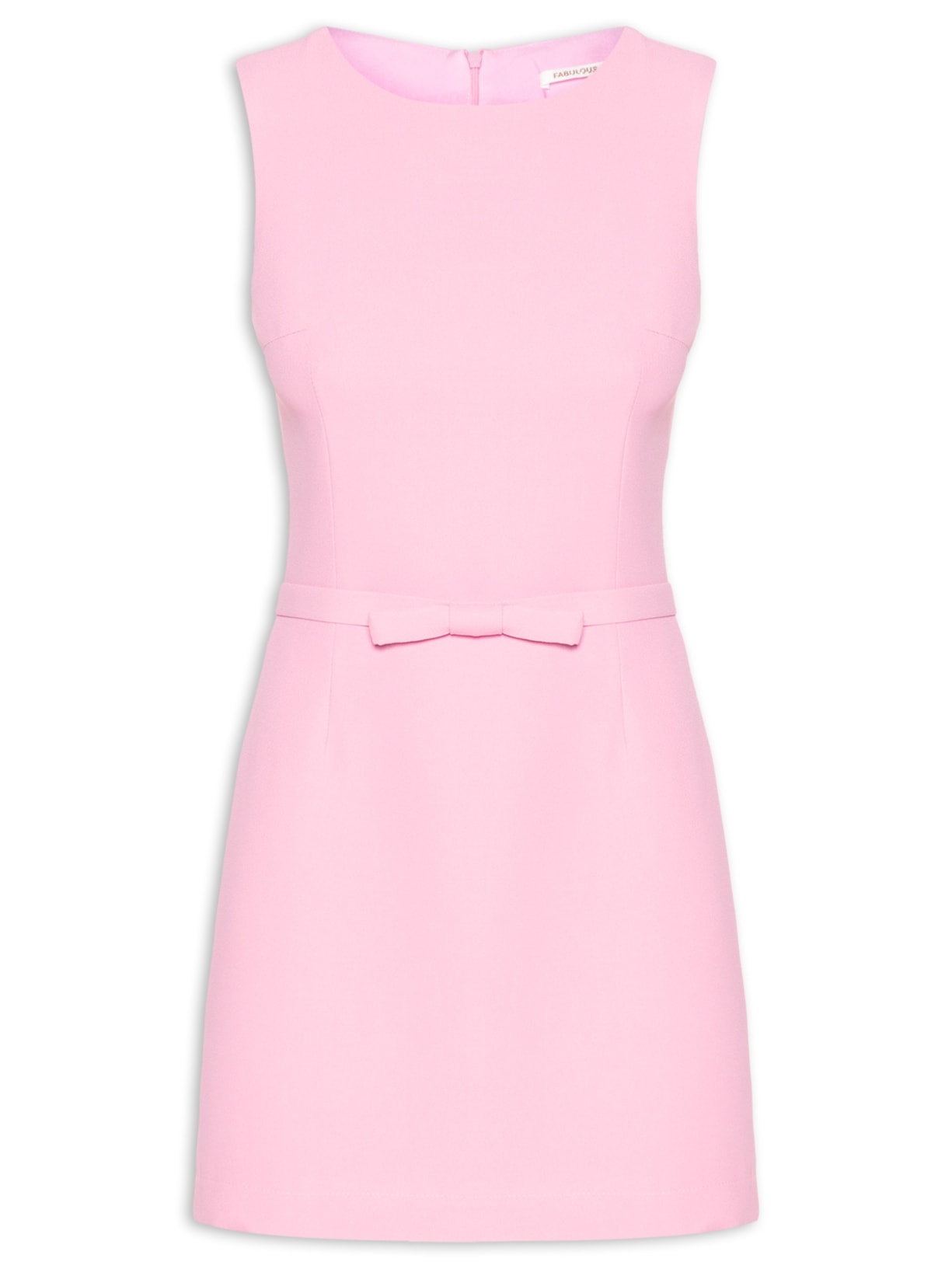 A vestido rosa é confeccionado em tecido leve sem elasticidade. A peça justa ao corpo possui decote redondo, alças médias, cavas regulares, recorte posterior, pences posteriores e frontais, forro, comprimento curto e fechamento posterior por zíper invisível. Acompanha cinto para uso opcional no mesmo tecido e cor com espessura fina, laço sobreposto na parte frontal e fechamento posterior por colchete.