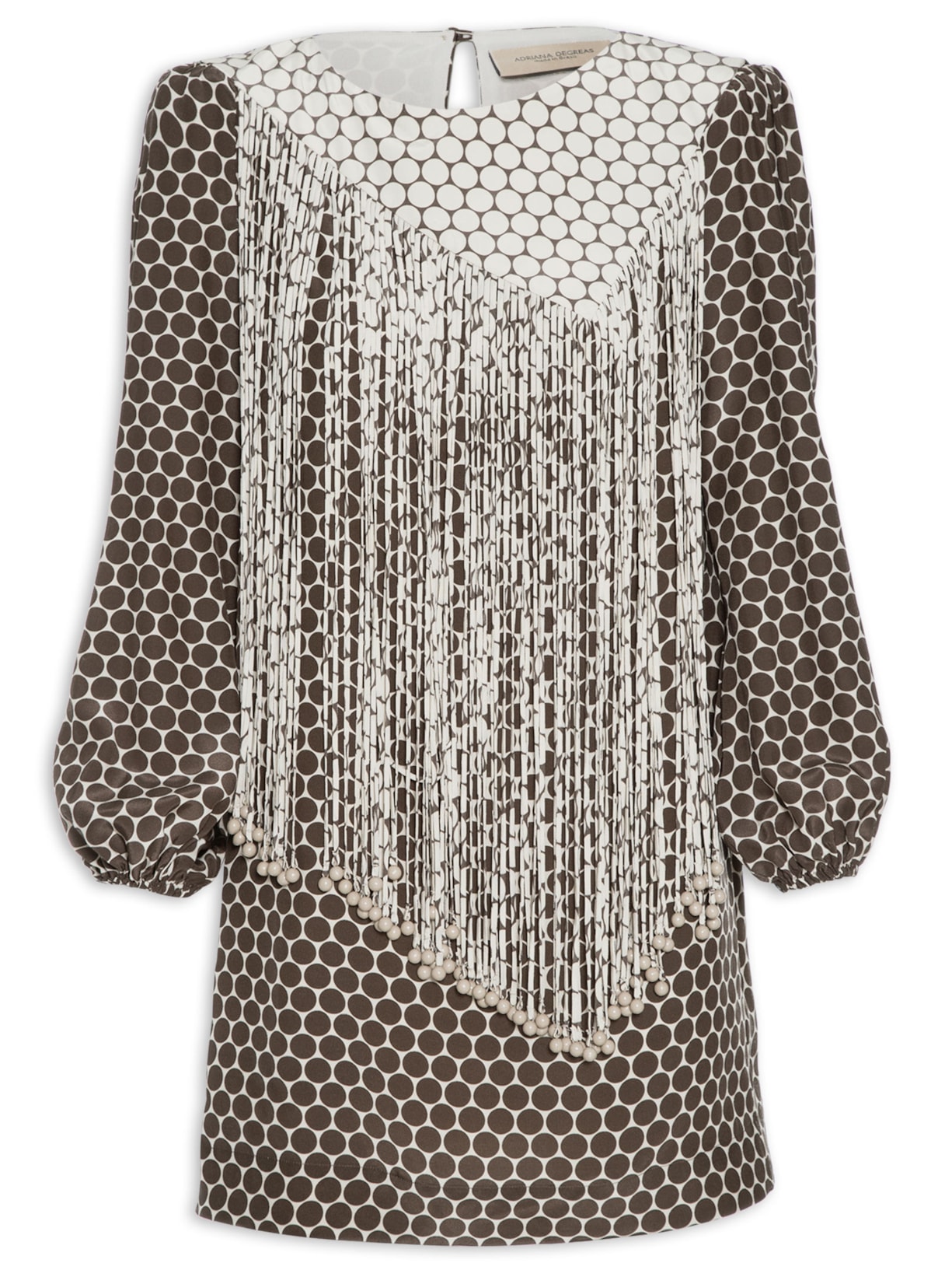 O vestido marrom é confeccionado em seda. A peça possui decote redondo, mangas longas bufantes, ombreira, estampa de poá em cor contrastante, forro, recorte posterior vazado com botão aplicado, comprimento curto, recorte frontal superior assimétrico com aplicação de franjas com ponteiras com detalhe de esferas, shape solto, caimento reto e acabamento pespontado.