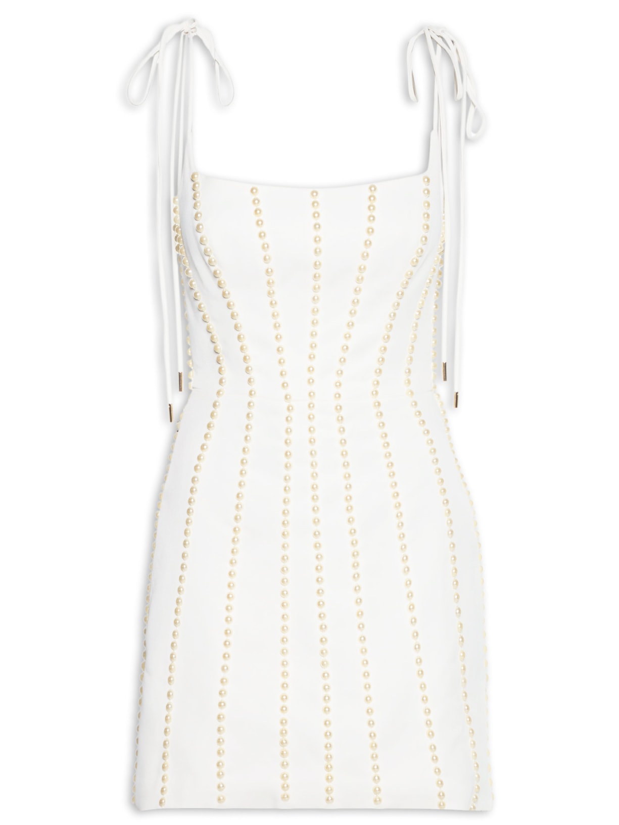 O vestido branco é confeccionado por tecido tecido leve com baixa elasticidade. A peça justa ao corpo possui decote quadrado, alças finas estendidas para amarração, aplicações de pedras na superfície, forro, fechamento posterior por zíper e comprimento curto.