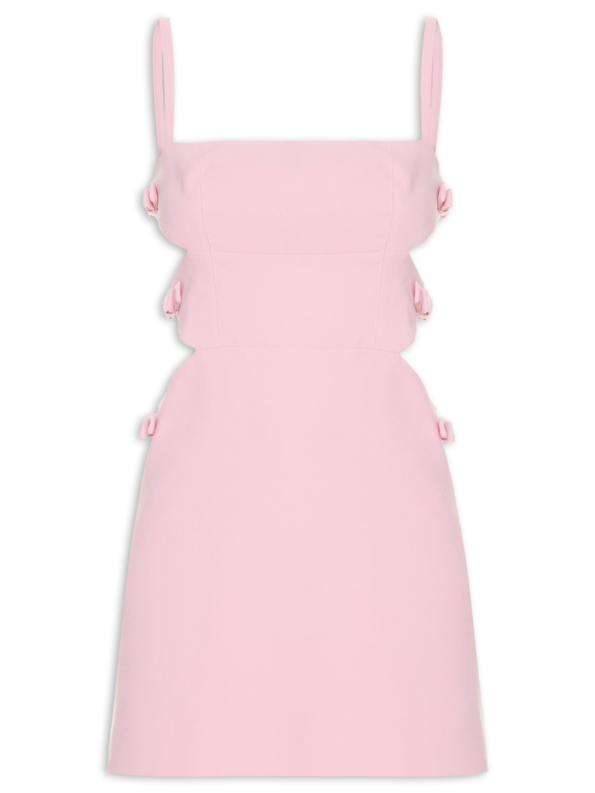 O vestido rosa é confeccionado em tecido leve com superfície texturizada. A peça possui decote reto, alças finas, recortes frontais na altura do busto, laterais com recortes vazados e aplicação de laços, pences posteriores, forro, comprimento curto, shape justo e fechamento posterior por zíper.