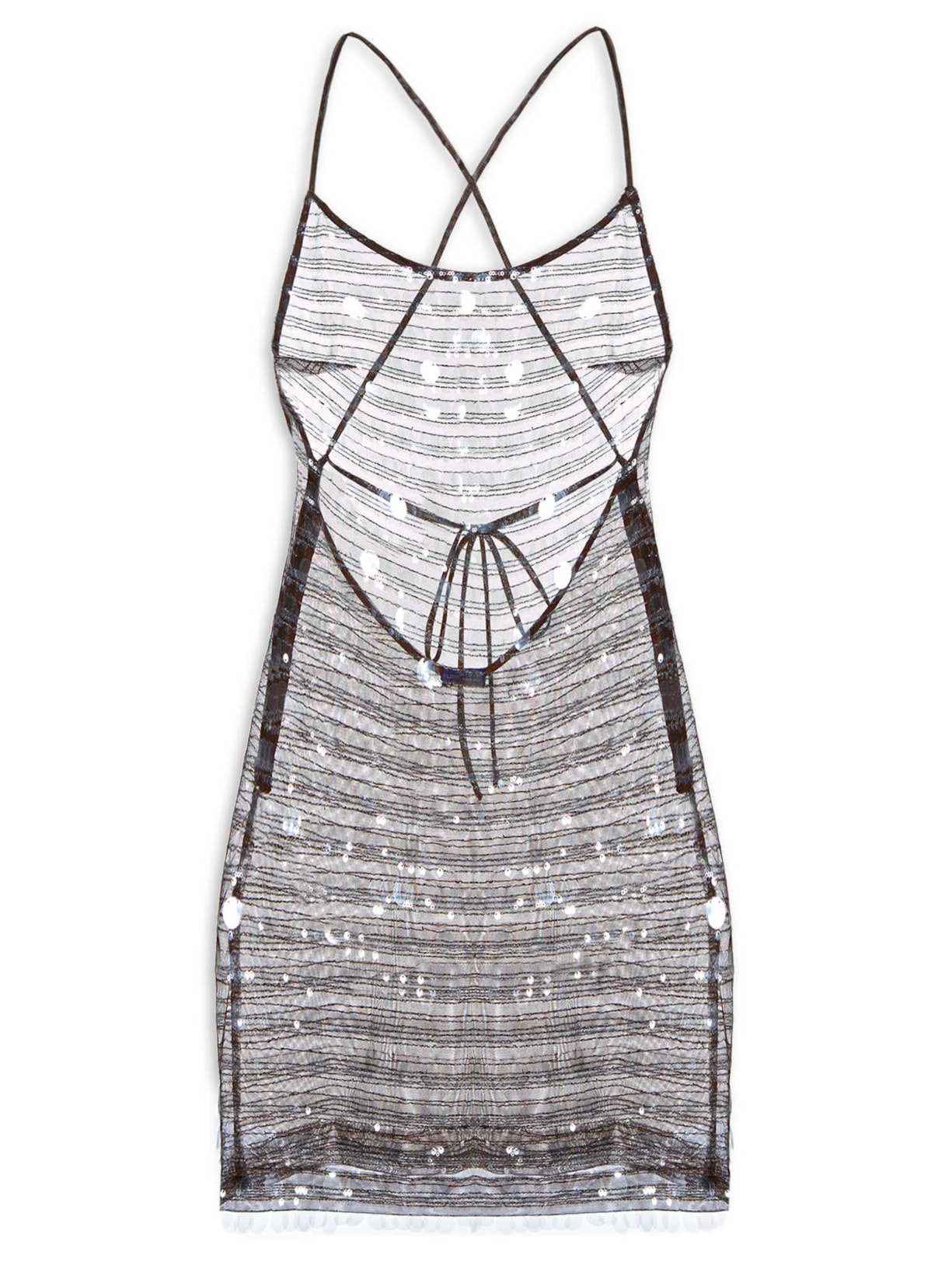 O vestido marrom é confeccionado em tule com superfície em paetê sem elasticidade. A peça solta ao corpo possui decote U, alças finas alongadas para amarração posterior, transparência e comprimento curto.