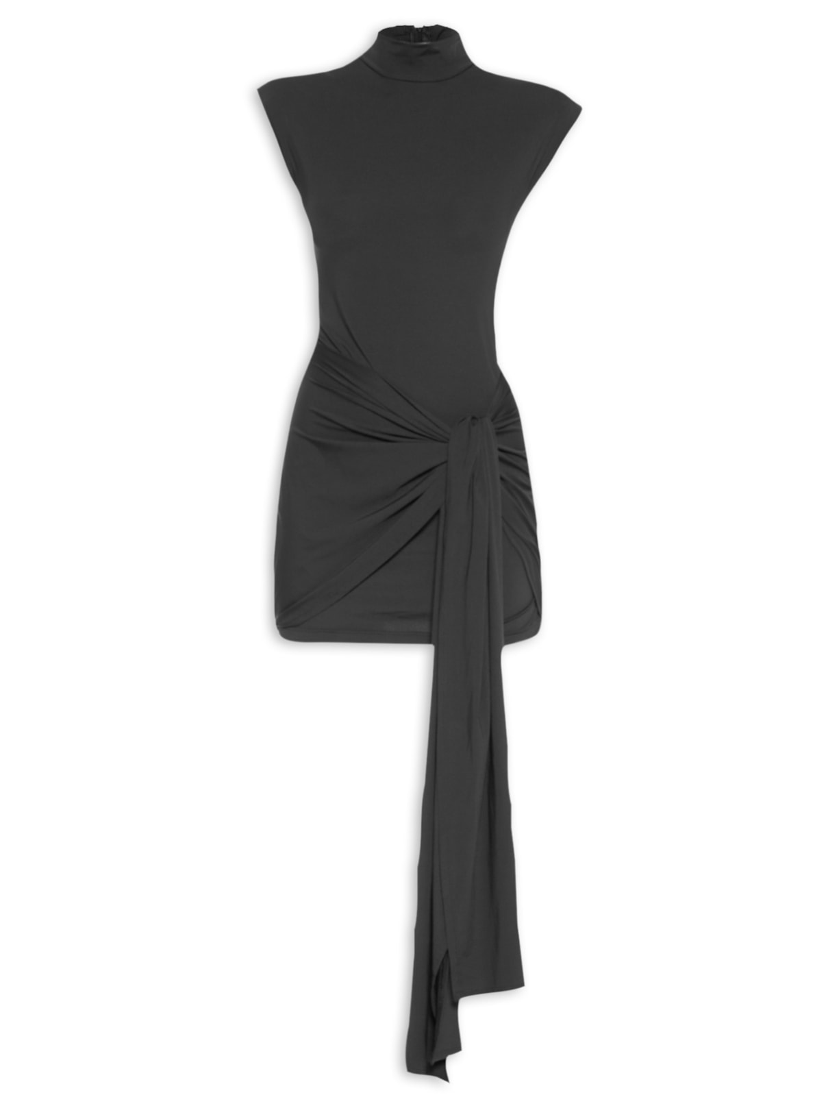 O vestido preto é confeccionado em malha de poliamida com média elasticidade. A peça justa ao corpo possui decote gola alta, ombros estendidos com ombreiras embutidas, tiras alongadas sobrepostas na parte frontal para amarração, sem bojo, comprimento curto e fechamento posterior em zíper.