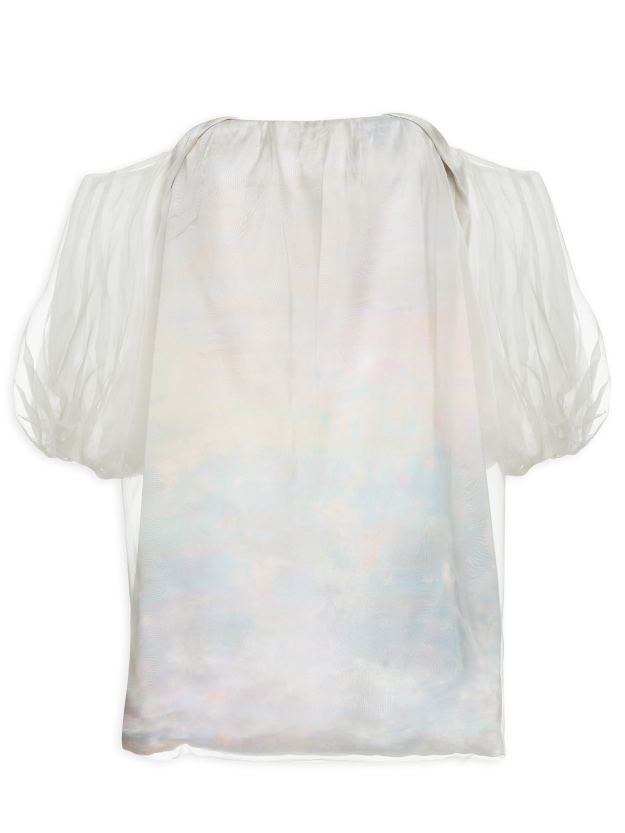 O vestido azul é confeccionado em tule sem elasticidade. A peça solta ao corpo possui decote ombro a ombro com elástico embutido, mangas curtas bufantes, estampa abstrata em cores contrastantes, forro com barbatanas embutidas para sustentação no busto, comprimento curto e fechamento posterior por zíper invisível.