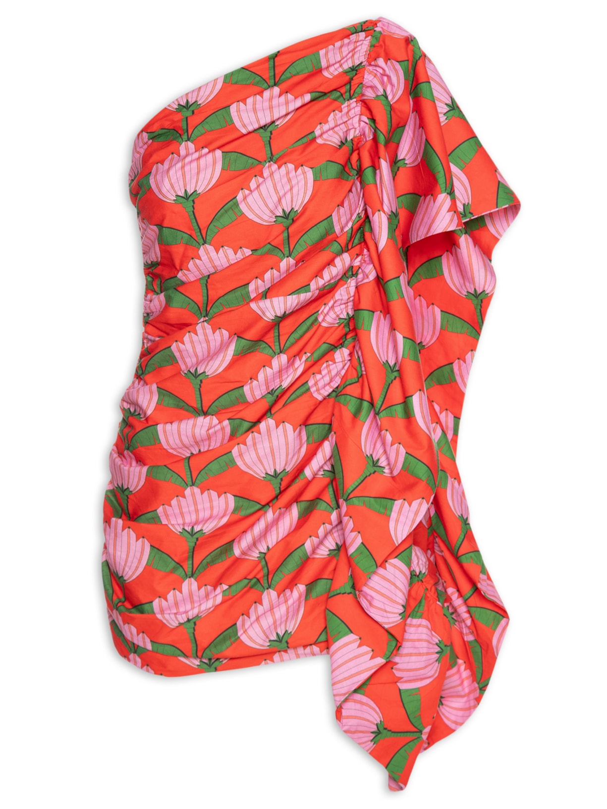 O vestido vermelho é confeccionado em tecido leve sem elasticidade. A peça solta ao corpo possui decote ombro único, manga curta e ampla com babado, recorte posterior com franzidos, drapeado nas partes posterior e frontal, estampa floral em cores contrastantes, assimetria, comprimento curto e fechamento posterior por zíper invisível.
