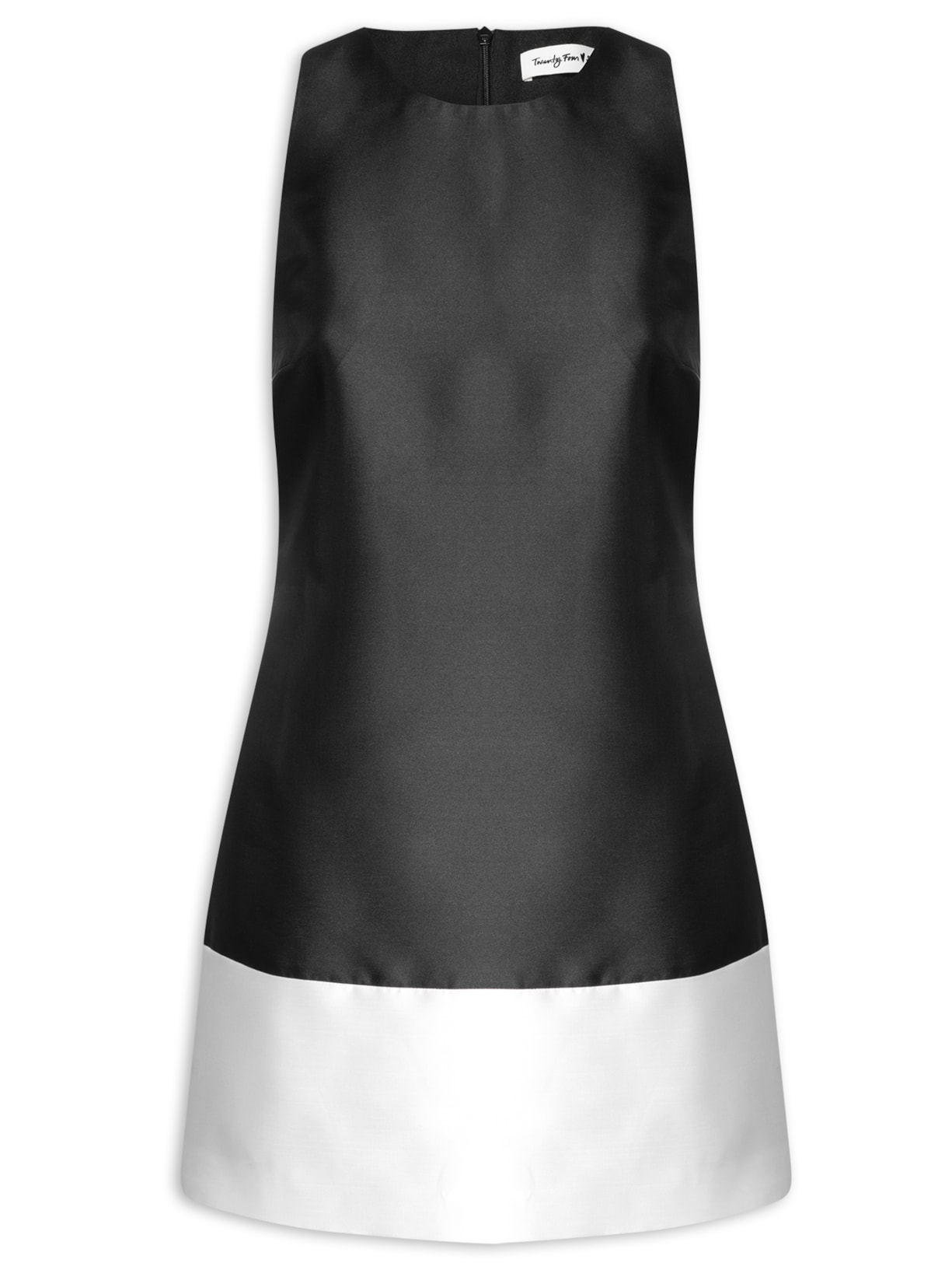 O vestido preto é confeccionado em tecido leve sem elasticidade. A peça justa na altura do busto e da cintura e solta no comprimento possui decote redondo, alças largas, cavas regulares, recorte posterior, pences nas partes posterior e frontal na altura do busto, recorte na barra na cor off white, sem bojo, forro, comprimento curto e fechamento posterior por zíper.