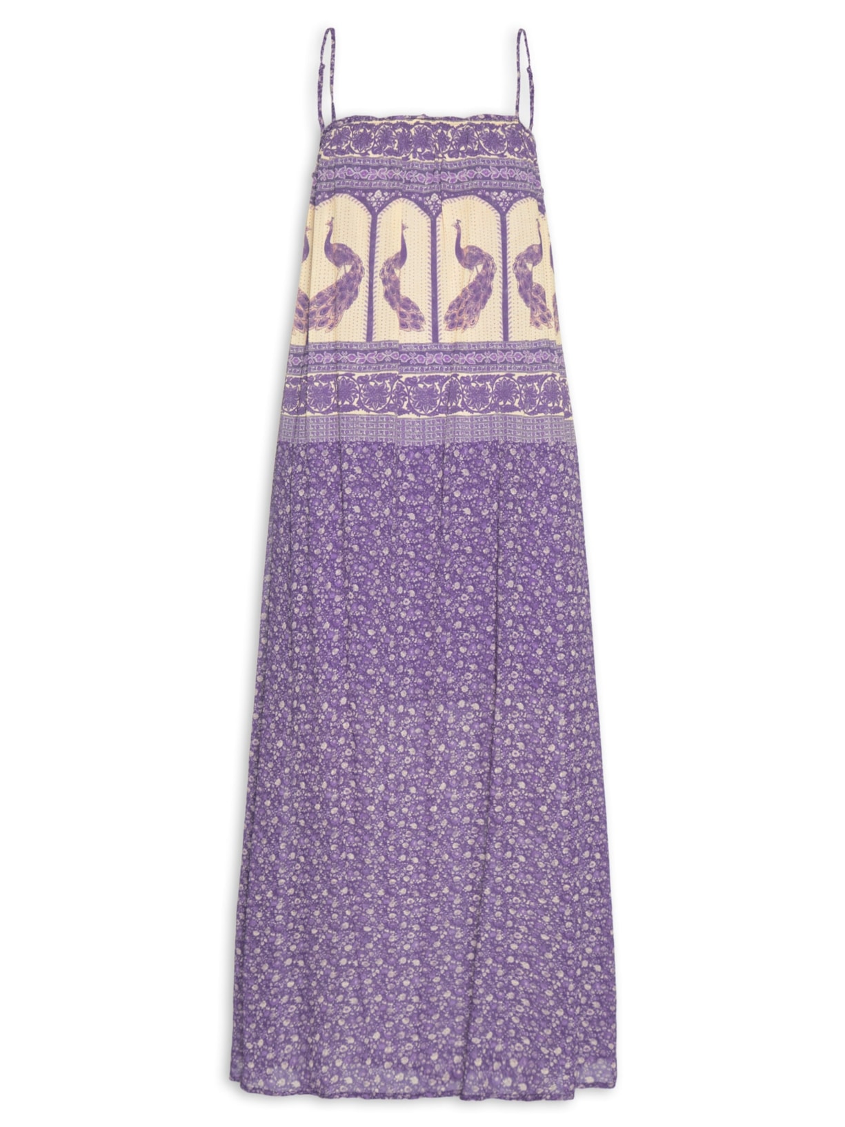 O vestido roxo é confeccionado em crepe sem elasticidade. A peça solta ao corpo, possui decote reto com acabamento por corte a fio, alças finas com regulagem, leve franzido frontal, mix de estampas em cores contrastantes, comprimento midi e meio forro.