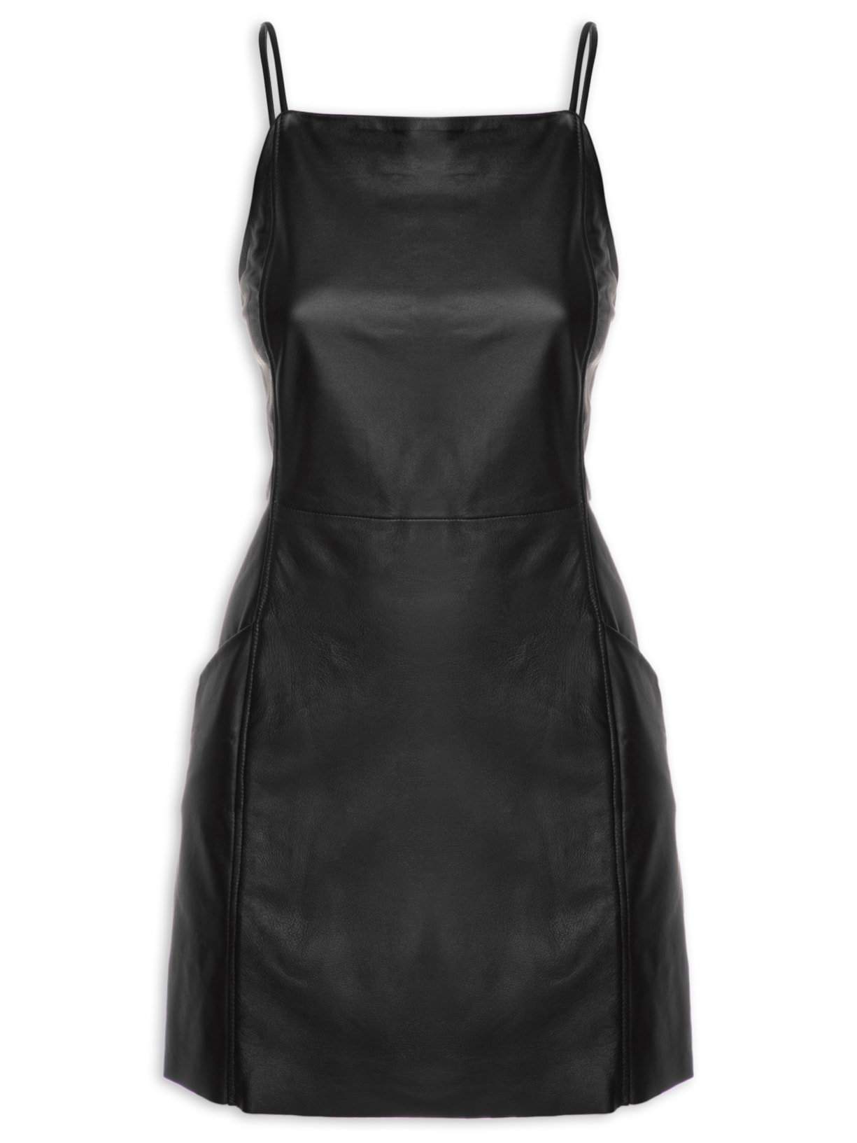 O vestido preto é confeccionado em couro. A peça possui decote trapézio, alças finas, cavas estendidas, recortes frontais e posteriores, bolsos laterais, comprimento curto, shape solto e fechamento posterior por zíper metalizado.