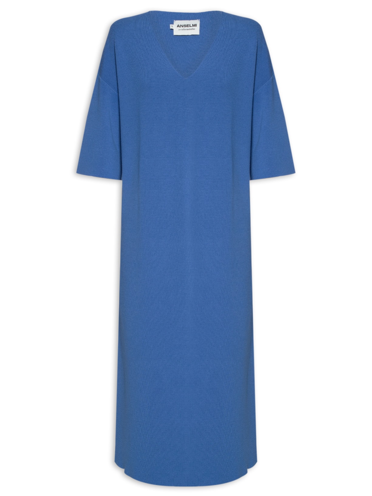 O vestido azul é confeccionado em tricot com alta elasticidade. A peça solta ao corpo possui decote V, mangas curtas, ombros estendidos, fendas laterais e comprimento midi.