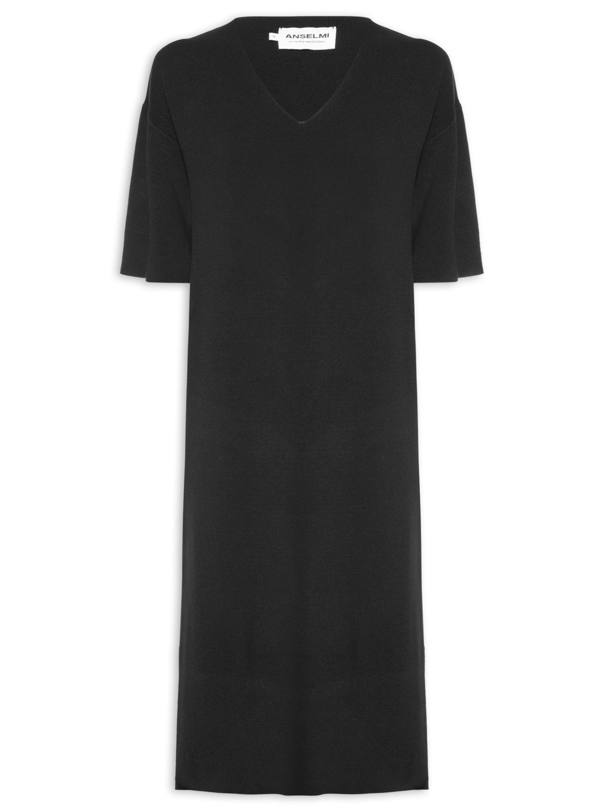 O vestido preto é confeccionado em tricot com alta elasticidade. A peça solta ao corpo possui decote V, mangas curtas, ombros estendidos, fendas laterais e comprimento midi.