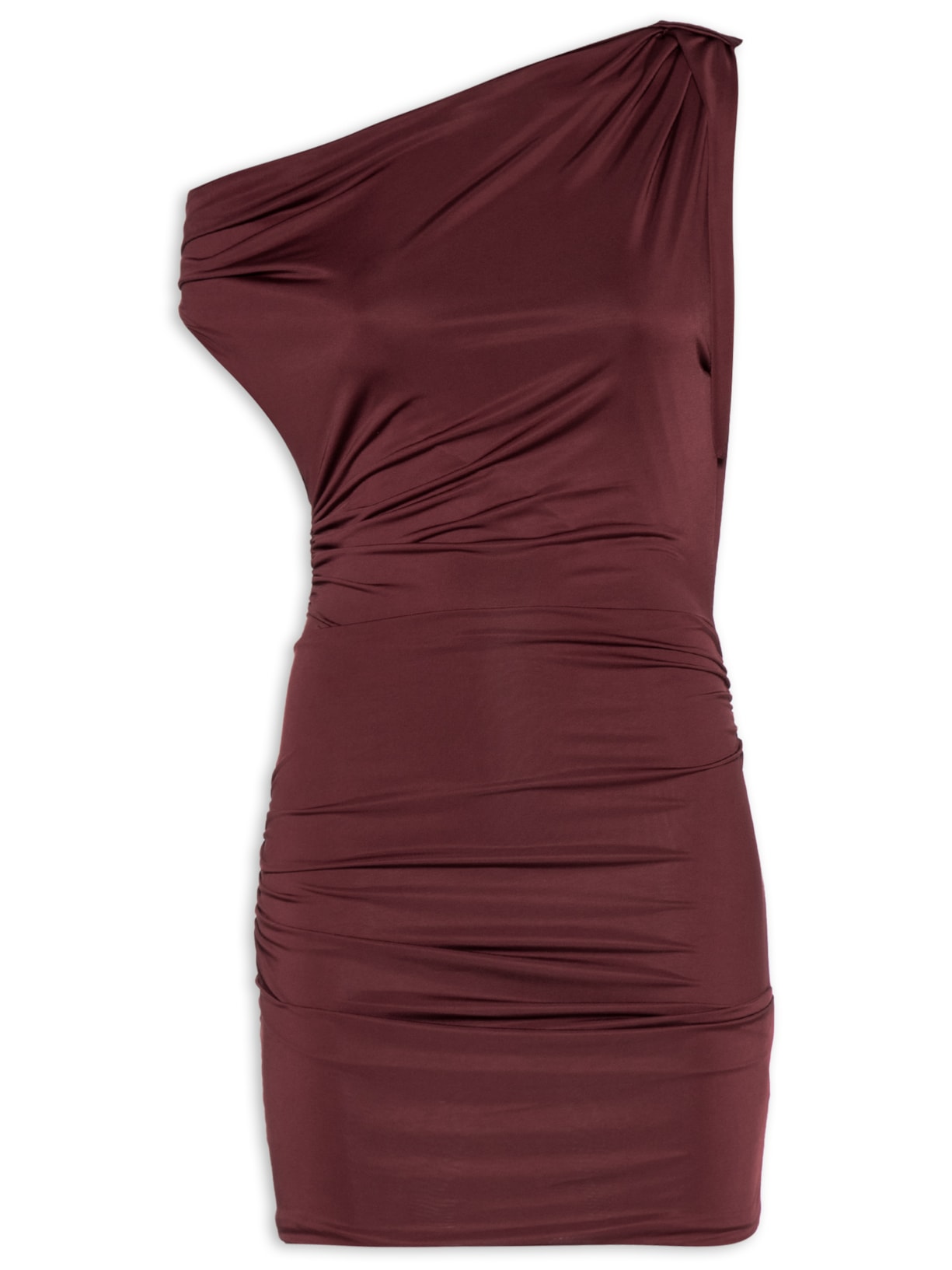 O vestido vinho é confeccionado em malha com alta elasticidade. A peça justa ao corpo possui decote ombro único, alças médias, cavas estendidas, drapeado nas partes posterior e frontal, detalhe de franzidos nas partes laterais, comprimento curto e não possui fechamento.