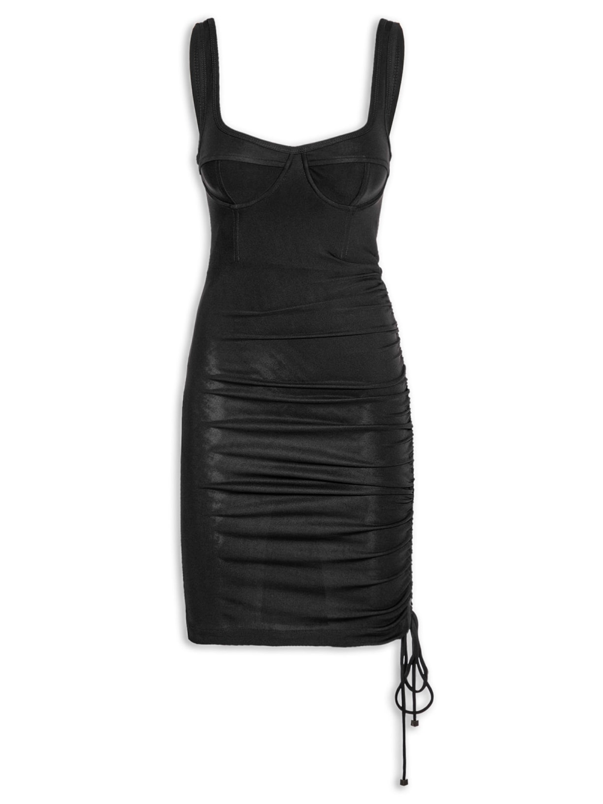 O vestido preto é confeccionado em malha. A peça possui decote V, alças médias, cavas regulares, recortes frontais, aros e barbatanas embutidos na parte frontal e posterior para sustentação, drapeado ajustável por cordão embutido na lateral, comprimento curto, shape justo, caimento reto e acabamento pespontado.
