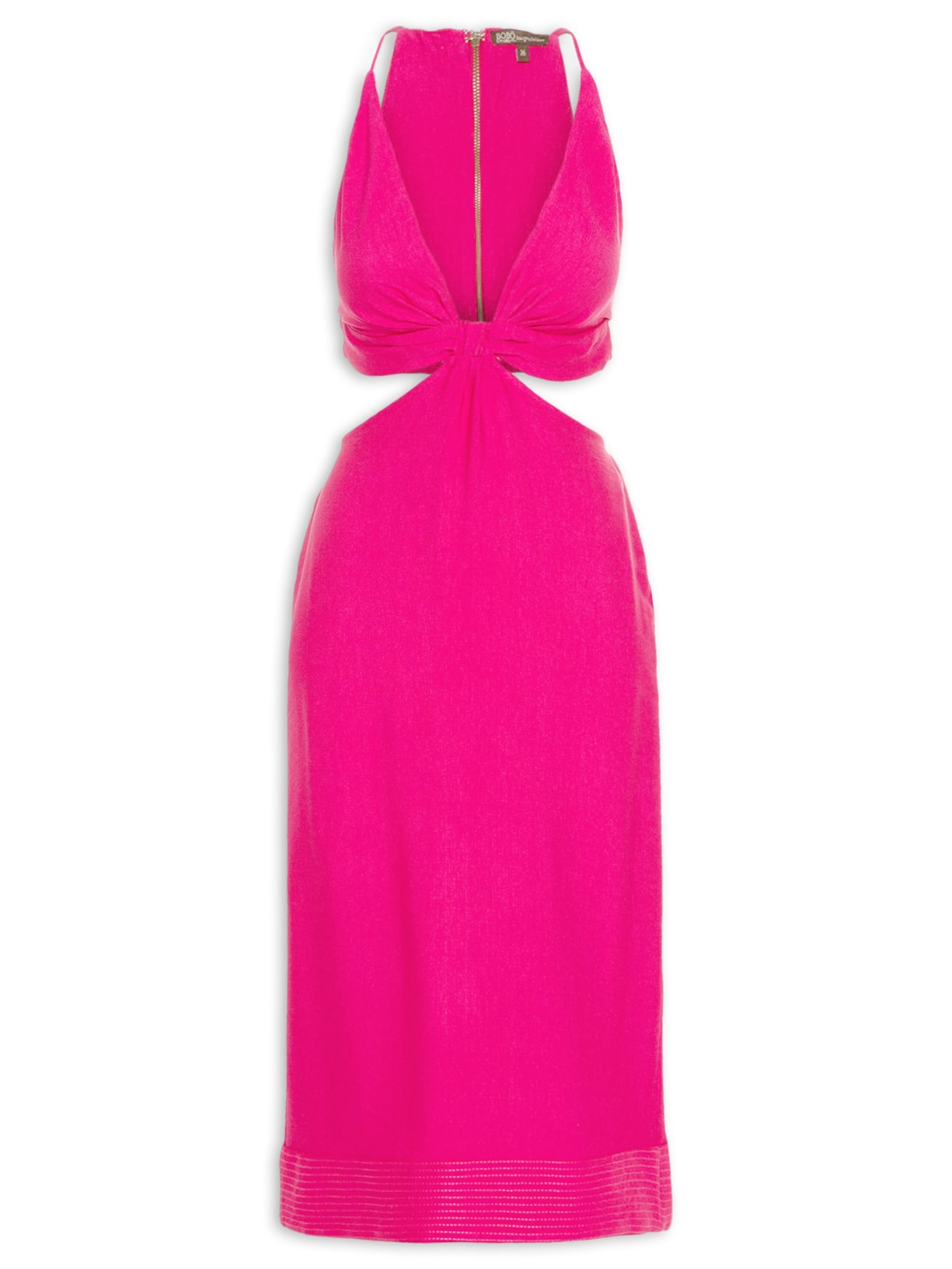 O vestido rosa é confeccionado em tecido leve. A peça possui decote em V, alças finas, detalhe frontal com franzido, cordão elástico embutido na parte posterior da cintura, recorte na altura da cintura, fenda posterior, comprimento midi, caimento reto, acabamento pespontado e fechamento posterior por zíper metalizado.