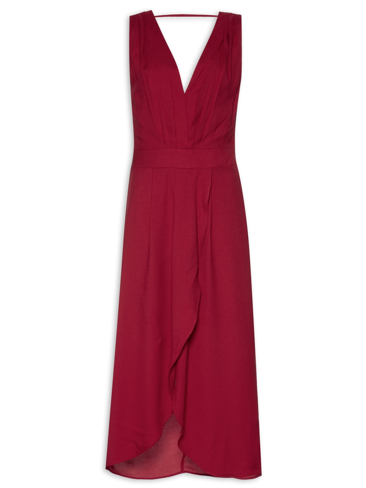O vestido vermelho é confeccionado em tecido leve sem elasticidade. A peça solta ao corpo possui decote V, alças largas, efeito drapeado na parte superior frontal e posterior, recorte na altura da cintura com pregas, fenda frontal, barra mullet*, forro, comprimento midi e fechamento lateral por zíper invisível.