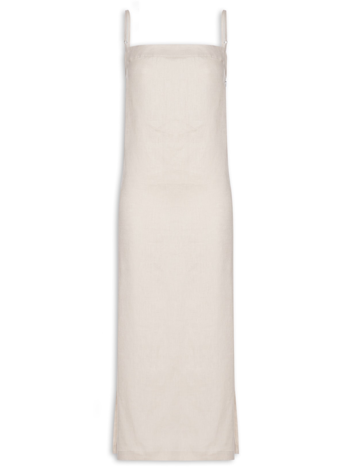 O vestido bege é confeccionado em linho sem elasticidade. A peça solta ao corpo possui decote quadrado, alças finas com ajustes, fendas laterais, fechamento por zíper e comprimento midi.