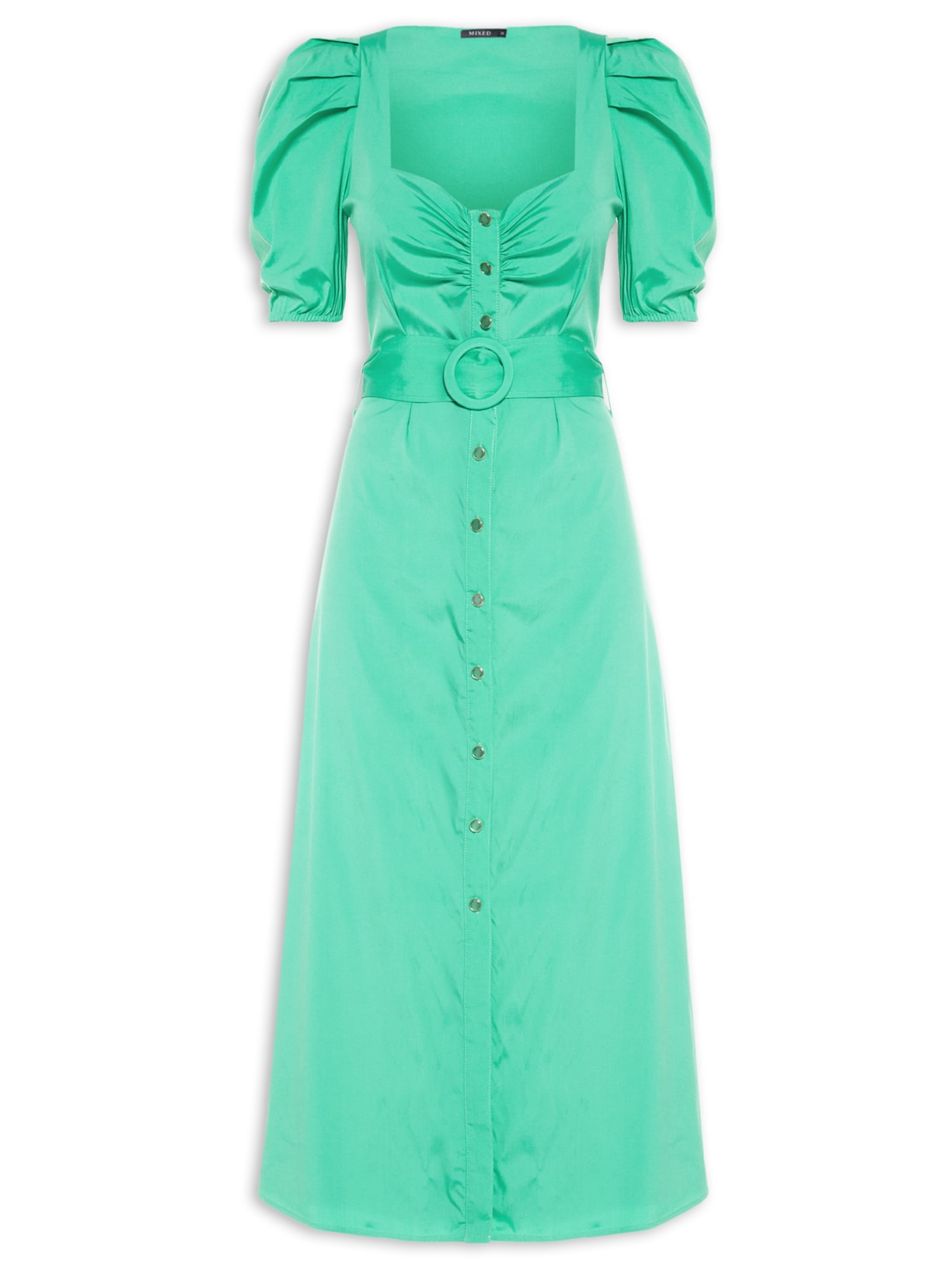 O vestido verde é confeccionado em tecido leve. A peça possui decote coração com franzidos, mangas curtas bufantes, passantes aplicados na altura da cintura, pences posteriores, fenda frontal, forro, comprimento midi, caimento reto, shape solto, acabamento pespontado e fechamento frontal por botões e lateral por zíper invisível. Acompanha cinto faixa para uso opcional.