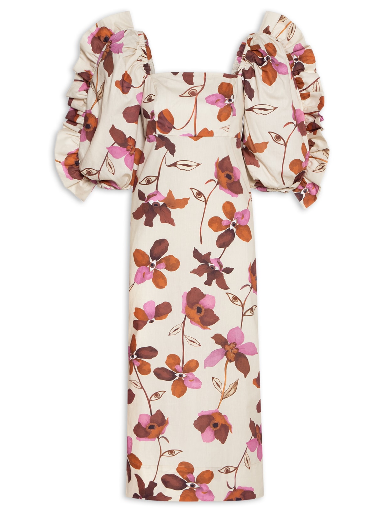 O vestido bege é confeccionado em tecido leve sem elasticidade. A peça solta ao corpo, possui decote quadrado, mangas 3/4 de modelo bufante com detalhe de babado aplicado e elástico embutido nos ombros e punhos, recorte abaixo do busto, bolsos frontais embutidos, fenda posterior, mix de estampas em cores contrastantes, forro curto e fechamento posterior por zíper invisível.