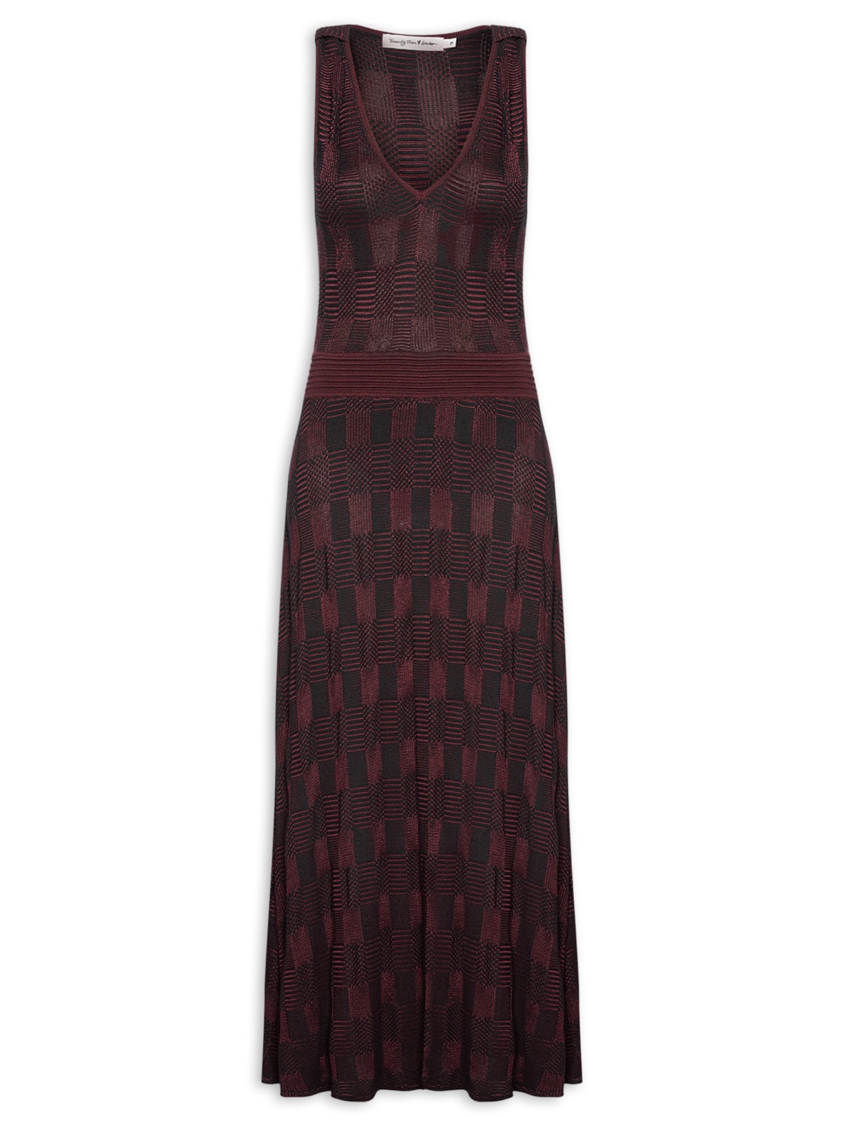 O vestido preto é confeccionado em tricot com média elasticidade. A peça solta ao corpo possui decote v, alças médias, padronagem com fios na cor vinho, elástico embutido na cintura e comprimento longo.