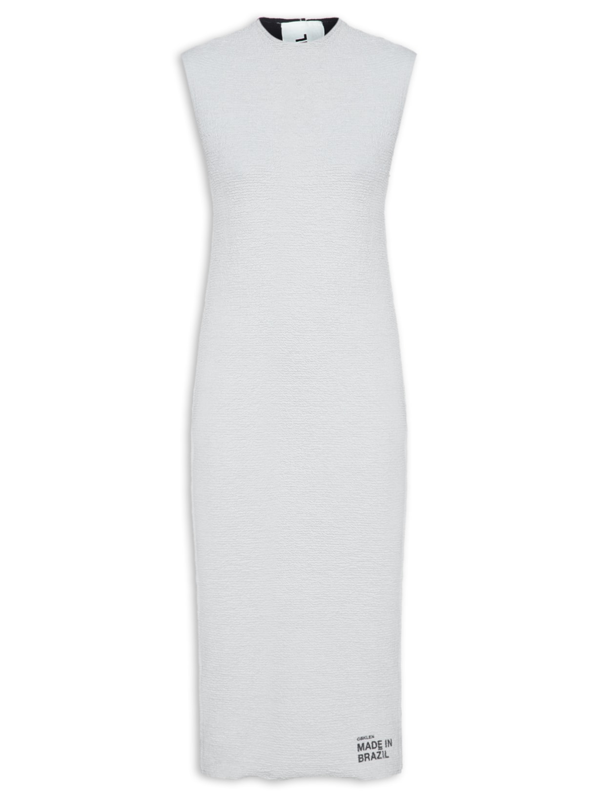 O vestido cinza é confeccionado em malha com superfície texturizada de alta elasticidade. A peça justa ao corpo de modelo dupla face possui decote redondo, cavas estendidas, recorte posterior, estampa frontal escrita aplicada em silk de tom contrastante, barra com corte a fio e comprimento midi, A outra face possui tom contrastante, tag da marca aplicada na parte posterior em tom contrastante, detalhe de costura batida e etiqueta da marca aplicada na lateral.