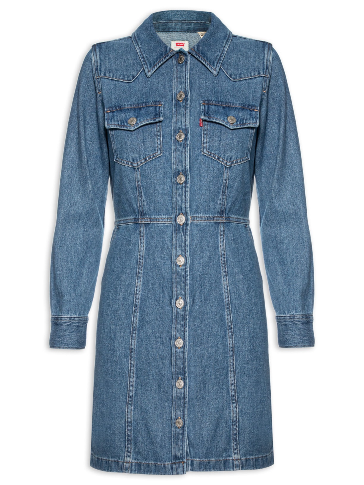 O vestido azul é confeccionado em sarja com lavagem jeans e sem elasticidade. A peça solta ao corpo possui colarinho clássico, mangas longas com abotoamento nos punhos, bolsos frontais com fechamento por botões na altura do busto, bolsos frontais de modelo faca na altura do quadril, recortes frontais e posteriores com detalhe de pespontos em cor contrastante, efeito estonado, comprimento curto e fechamento frontal em botões.