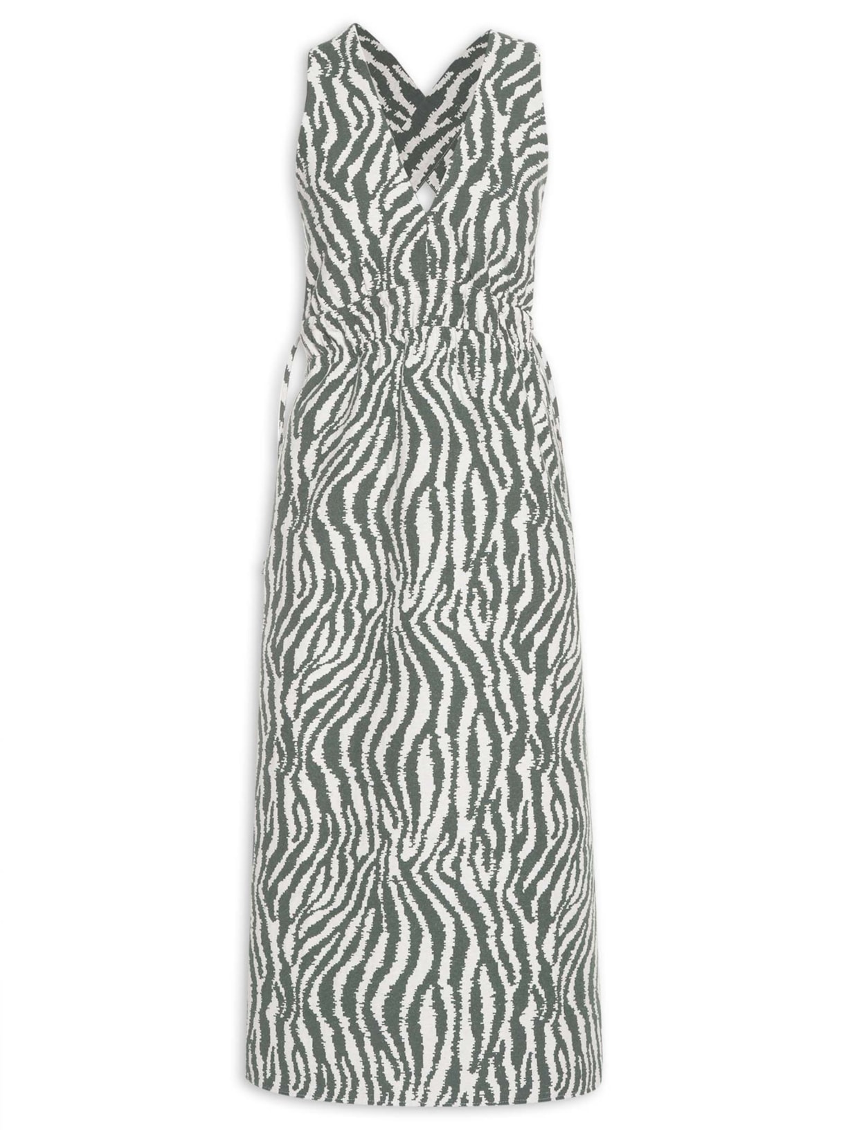 O vestido verde é confeccionado em tecido encorpado. A peça possui decote V, alças largas, recorte posterior vazado, elástico aplicado na altura da cintura, bolsos frontais modelo faca, estampa animal print em cor contrastante, comprimento midi, shape solto, caimento reto e acabamento pespontado.