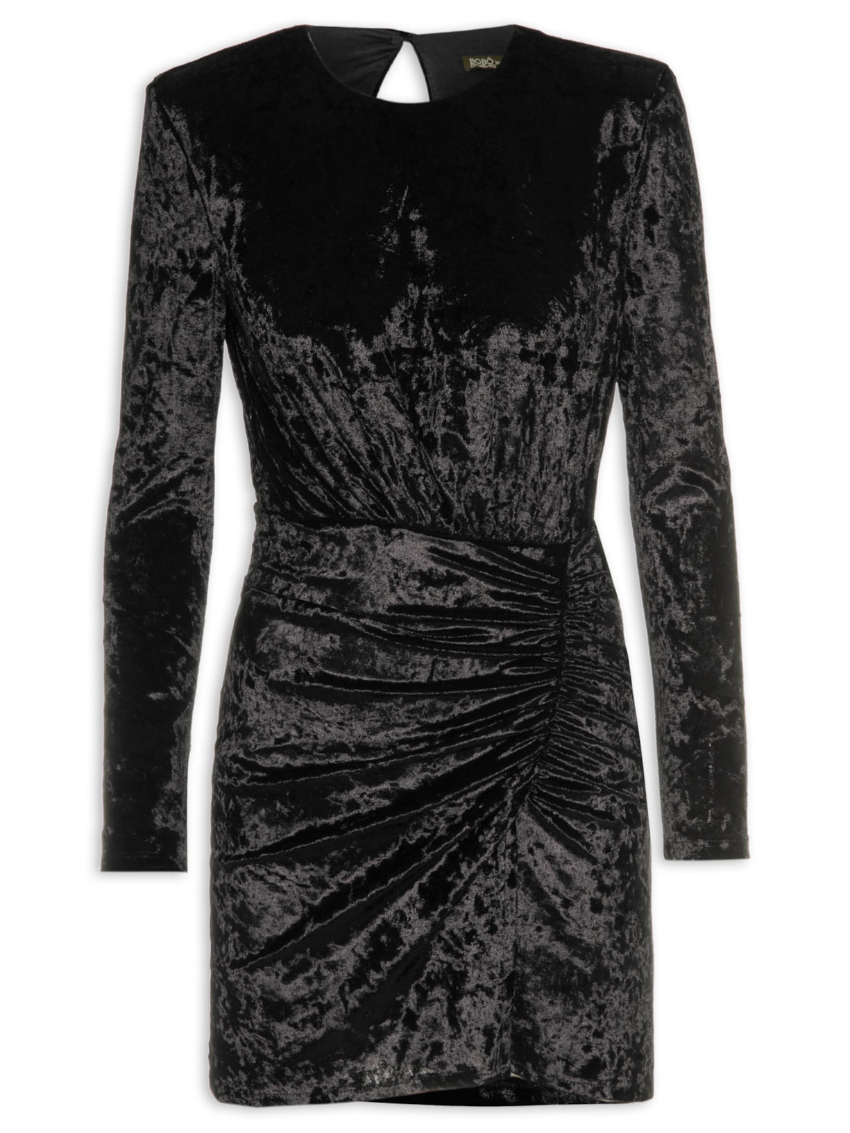 O vestido preto é confeccionado em veludo. A peça possui decote redondo, ombreiras embutidas, mangas longas, recorte posterior vazado, recorte frontal e posterior com detalhes de franzidos na altura da cintura, recorte frontal sobreposto com detalhe de drapeados, forro, comprimento curto, shape justo, caimento reto, acabamento pespontado e fechamento posterior por botões forrados.