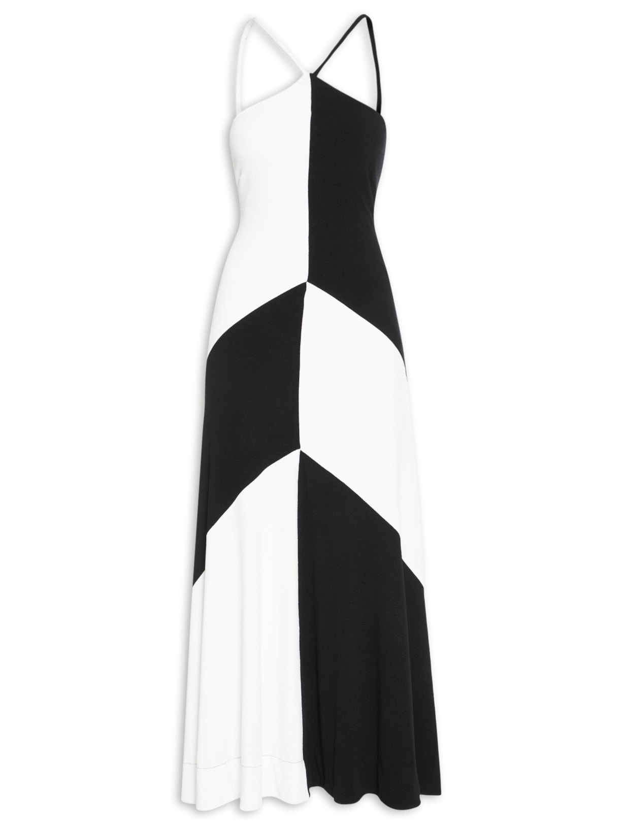O vestido preto é confeccionado em malha com superfície texturizada e alta elasticidade. A peça justa no busto e solta no corpo de modelo frente única possui decote trapézio, alças finas alongadas reguláveis por amarração posterior, meio forro, padronagem quadriculada na cor off white e comprimento midi.