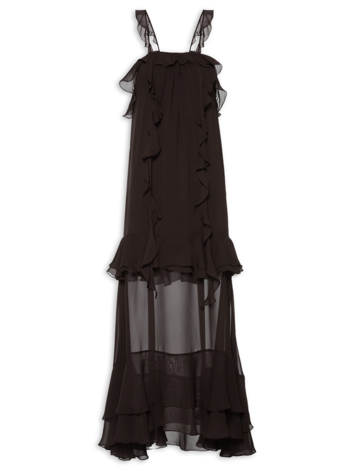 O vestido marrom é confeccionado em tecido leve sem elasticidade. A peça solta ao corpo possui decote reto, alças finas com tecido sobreposto para efeito de babados, elástico embutido na parte posterior, faixas de tecido aplicadas nas partes frontal e posterior para efeito de babados, transparência no comprimento, forro, tag da marca em metal aplicada na parte posterior e comprimento midi.