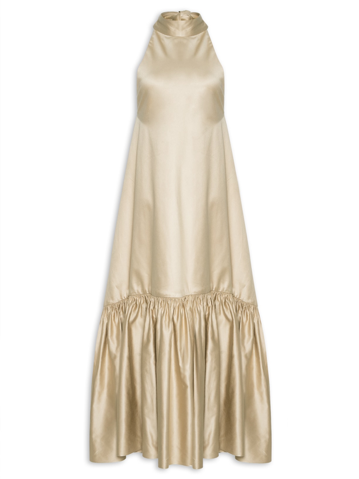 O vestido bege é confeccionado em tecido encorpado com superfície acetinada sem elasticidade. A peça solta ao corpo possui decote trapézio com gola alta e faixas posterior estendidas para amarração, cavas estendidas, recorte posterior vazado, recorte com detalhes de franzidos na altura do quadril, forro e comprimento midi.