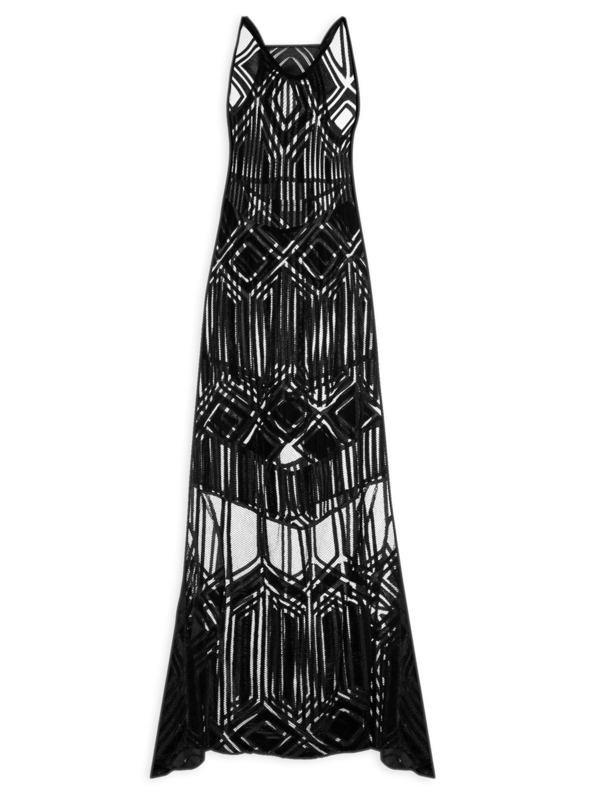 O vestido preto é confeccionado em tela sem elasticidade. A peça solta ao corpo possui decote V, alças finas duplas, recorte na altura da cintura, recortes geométricos sobrepostos em veludo, transparência, sem forro e comprimento longo.