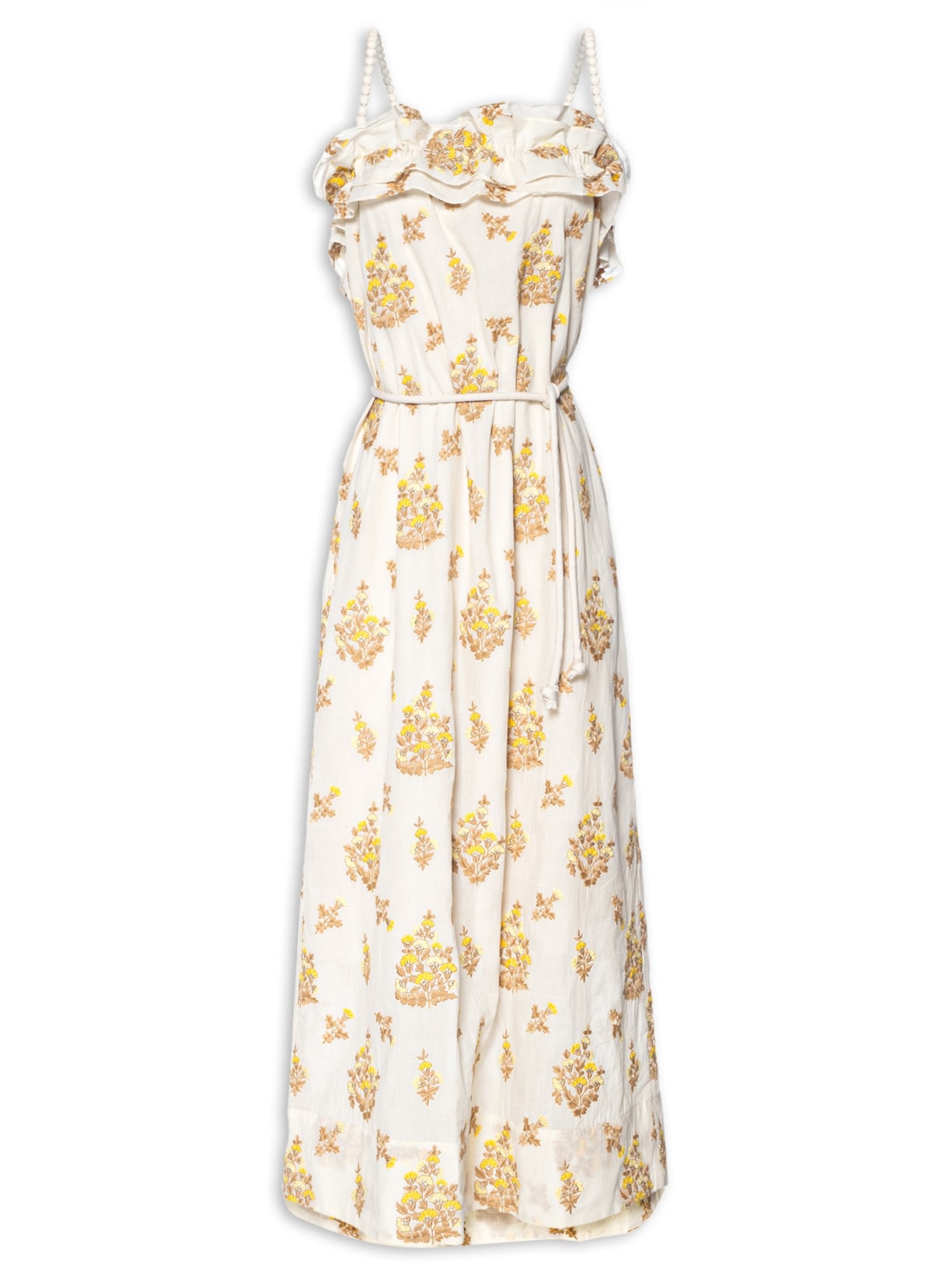 O vestido bege é confeccionado em tecido leve sem elasticidade. A peça solta ao corpo possui decote reto com aplicação de babados, alças finas reguláveis em formato de esferas, transparência, forro, barra estendida, aplicação de bordado floral com detalhes metalizados em tons contrastantes e comprimento midi. Acompanha tira alongada para amarração na cintura.
