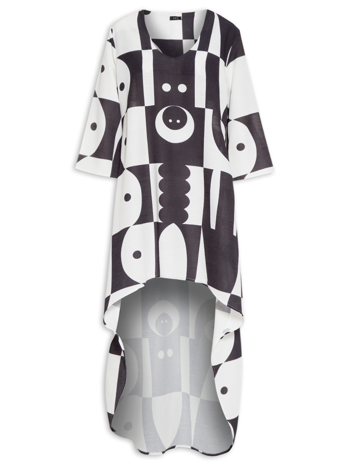 o vestido Preto é Confeccionado Em tecido Leve Sem Elasticidade. A Peça Solta Ao Corpo Possui decote U, Ombros Estendidos, Mangas 7/8, Estampa Geométrica Em Cor Contrastante, Barra Mullet* Arredondada E Comprimento Midi.