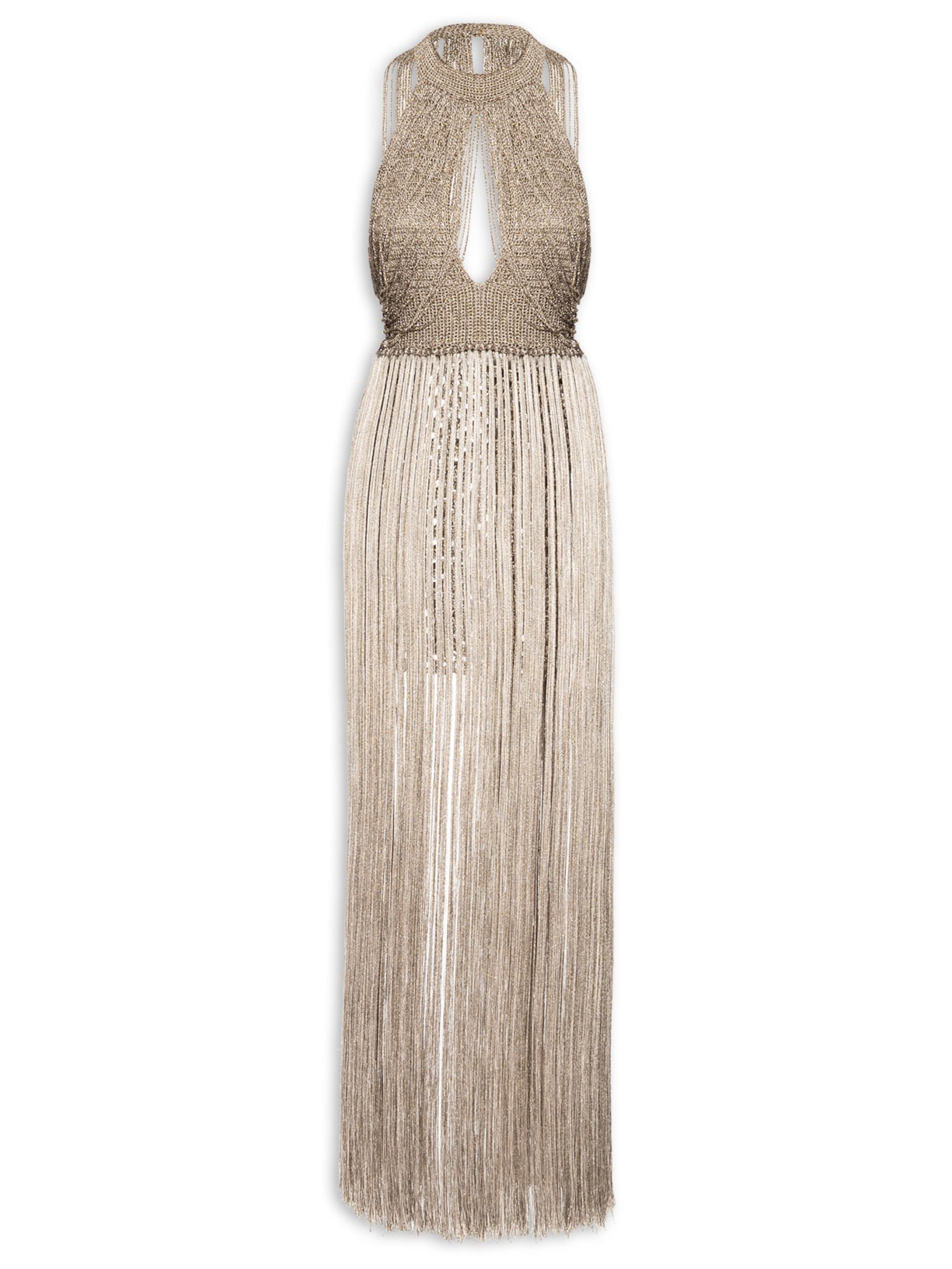 O vestido dourado é confeccionado em crochê com superfície em fios de lurex. A peça possui decote gota, detalhe em camadas sobrepostas na altura do busto se estendendo para a parte posterior, recorte posterior vazado, aplicação frontal e posterior de franjas alongadas, comprimento longo, shape solto, caimento reto, acabamento canelado e fechamento posterior por botões.