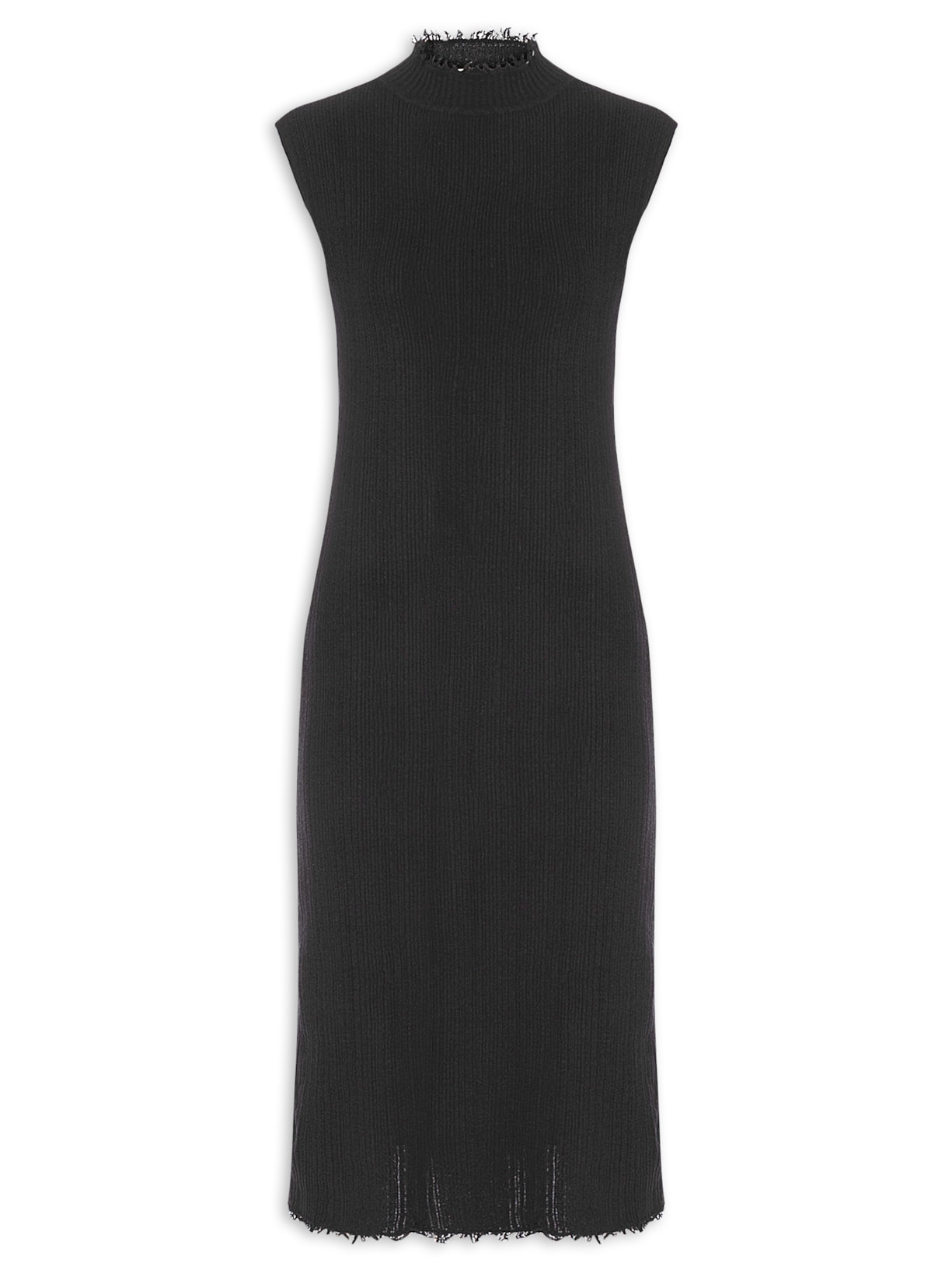 O vestido preto é confeccionado em tricot com superfície canelada e alta elasticidade. A peça justa ao corpo possui gola alta, cavas regulares, barra com desfiados e comprimento midi.
