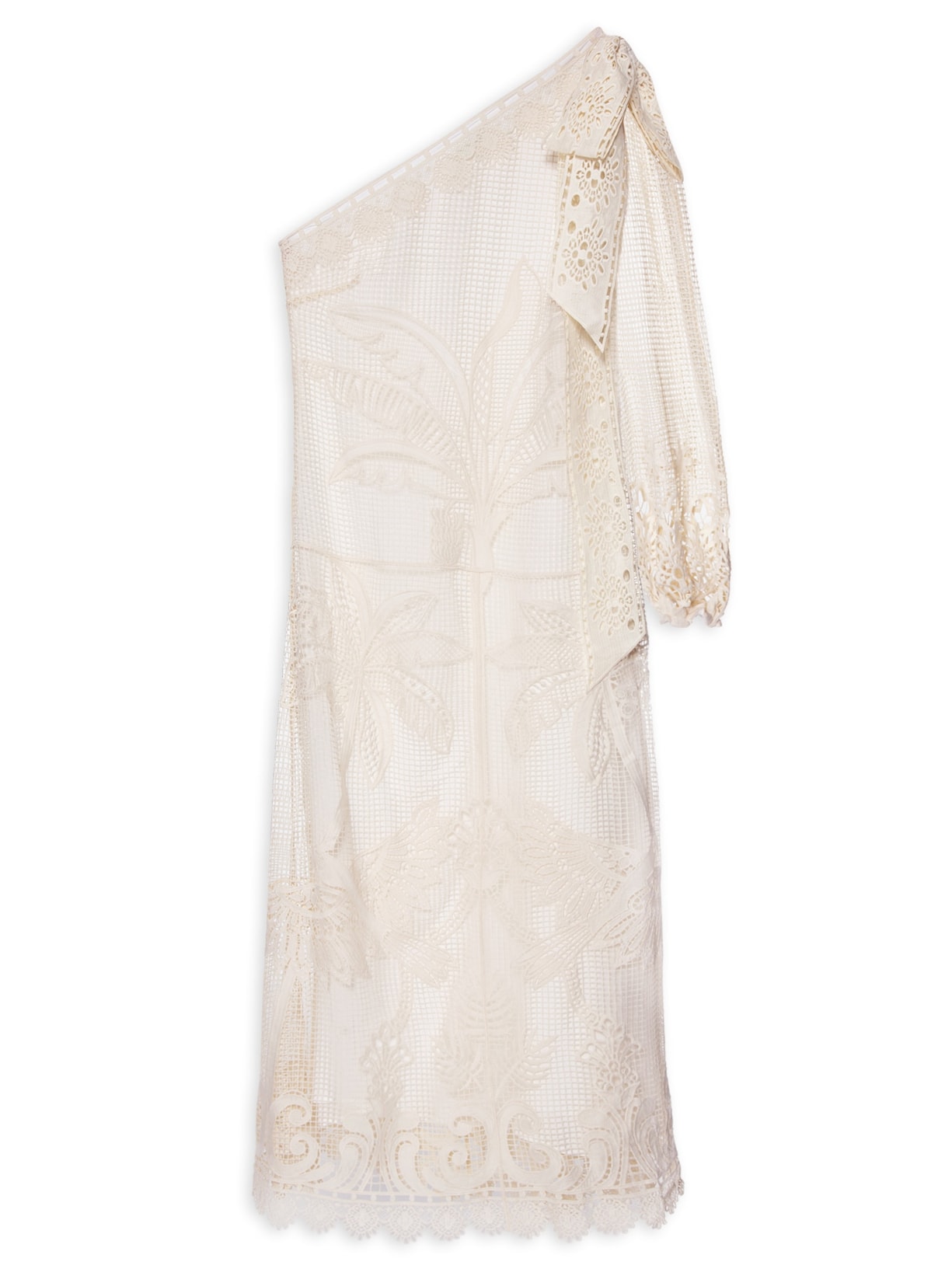 O vestido branco é confeccionado por renda sem elasticidade. A peça solta ao corpo possui decote combro único, manga longa com elástico embutido no punho e leve transparência, aplicação de laço no ombro, forro, fechamento lateral por zíper e comprimento longo.