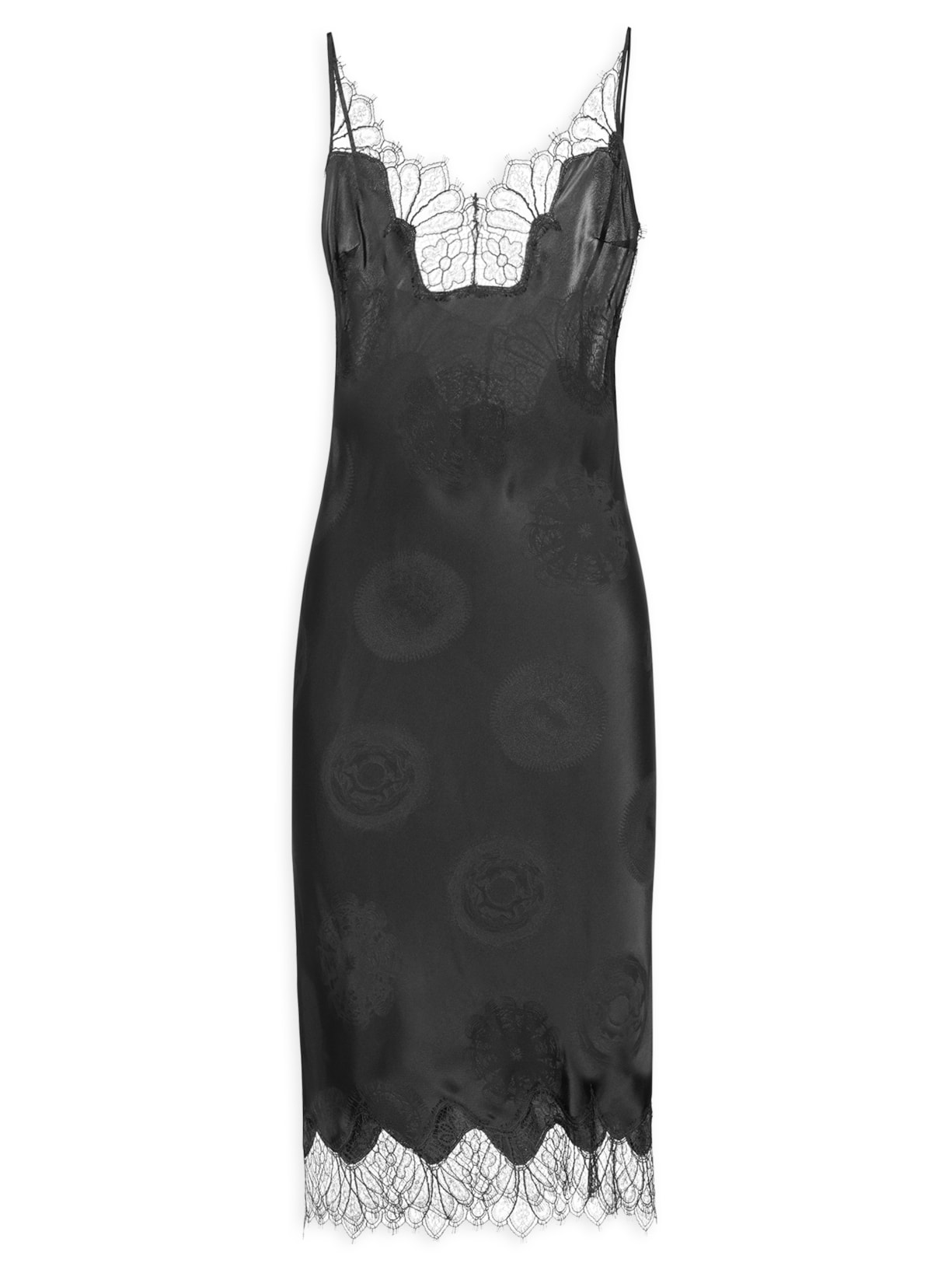 O vestido preto é confeccionado em jacquad com superfície acetinada sem elasticidade. A peça solta ao corpo, possui decote em V com detalhe em renda aplicada, alças finas com regulagem, tag metalizada da marca aplicada na parte posterior do decote, padronagem detalhada fosca, barra ondulada com renda aplicada e comprimento midi.