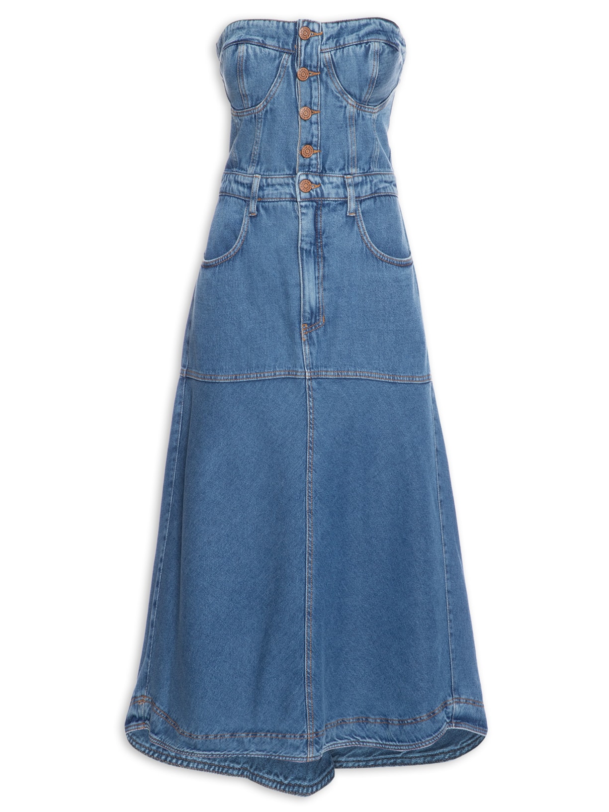 O vestido azul é confeccionado em sarja com lavagem em jeans sem elasticidade. A peça de modelo tomara que caia justa na altura do busto e da cintura e solta no comprimento possui decote reto, recortes posteriores e frontais, sem bojo, passantes na altura da cintura, tag da marca bordada na parte posterior, bolsos posteriores e frontais, efeito estonado, comprimento midi e fechamento frontal por botões e zíper.