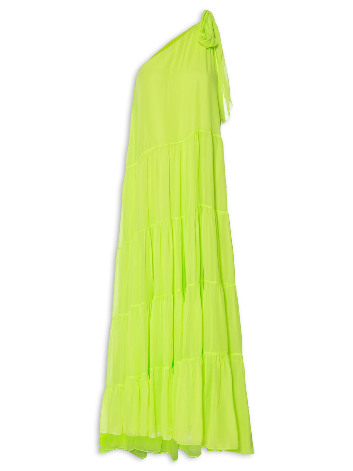 O vestido verde neon é confeccionado em tecido leve. A peça possui decote ombro único com faixa estendida para amarração, cavas estendidas, decote posterior nadador, recortes em camadas com detalhes de franzidos, forro, comprimento longo e shape solto.