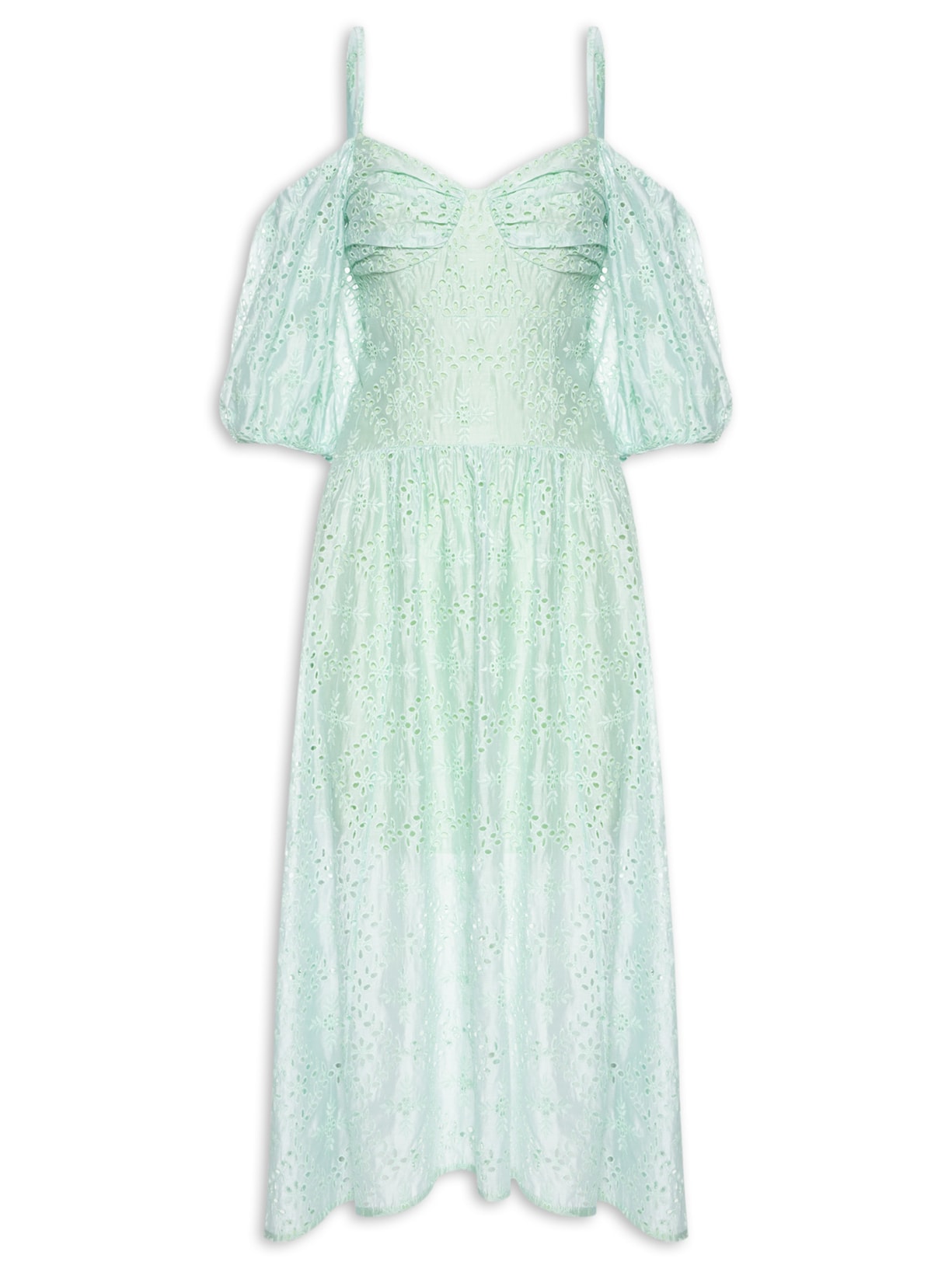O vestido verde é confeccionado em laise sem elasticidade. A peça justa no busto e solta no comprimento, possui decote coração, alças finas, mangas caídas de comprimento 3/4 com elástico embutido nos ombros e punhos, pregas na parte frontal do busto, recortes frontais, cintura deslocada com franzido, lastex aplicado na parte posterior, tag metálica da marca na parte posterior do decote, leve transparência inferior, comprimento midi, forro curto e fechamento posterior por zíper invisível.