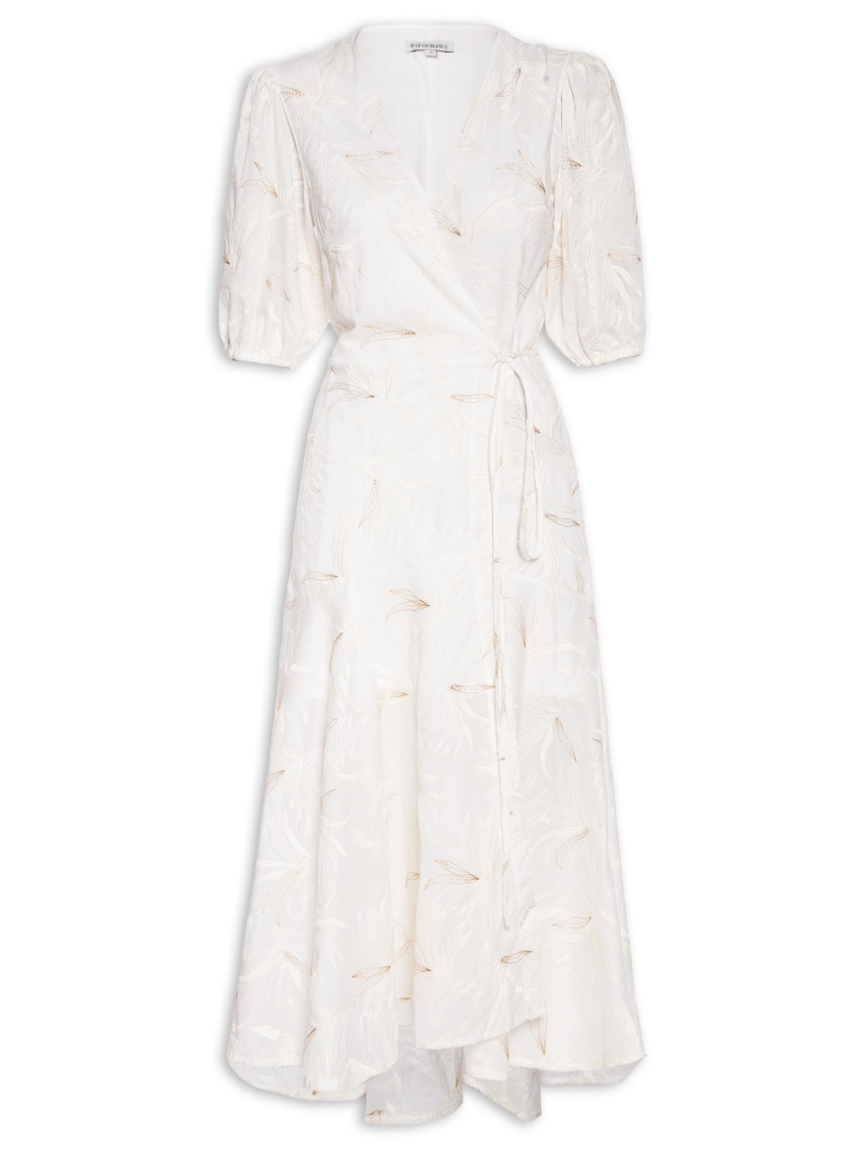 O vestido branco é confeccionado por tecido leve sem elasticidade. A peça solta ao corpo possui decote V transparência, mangas curtas com elástico embutido, bordados figurativos de folhagens na cor bege, tira estendida aplicada na cintura, tag da marca aplicada no decote posterior, forro, barra mullet*, fechamento por amarração frontal e comprimento midi.