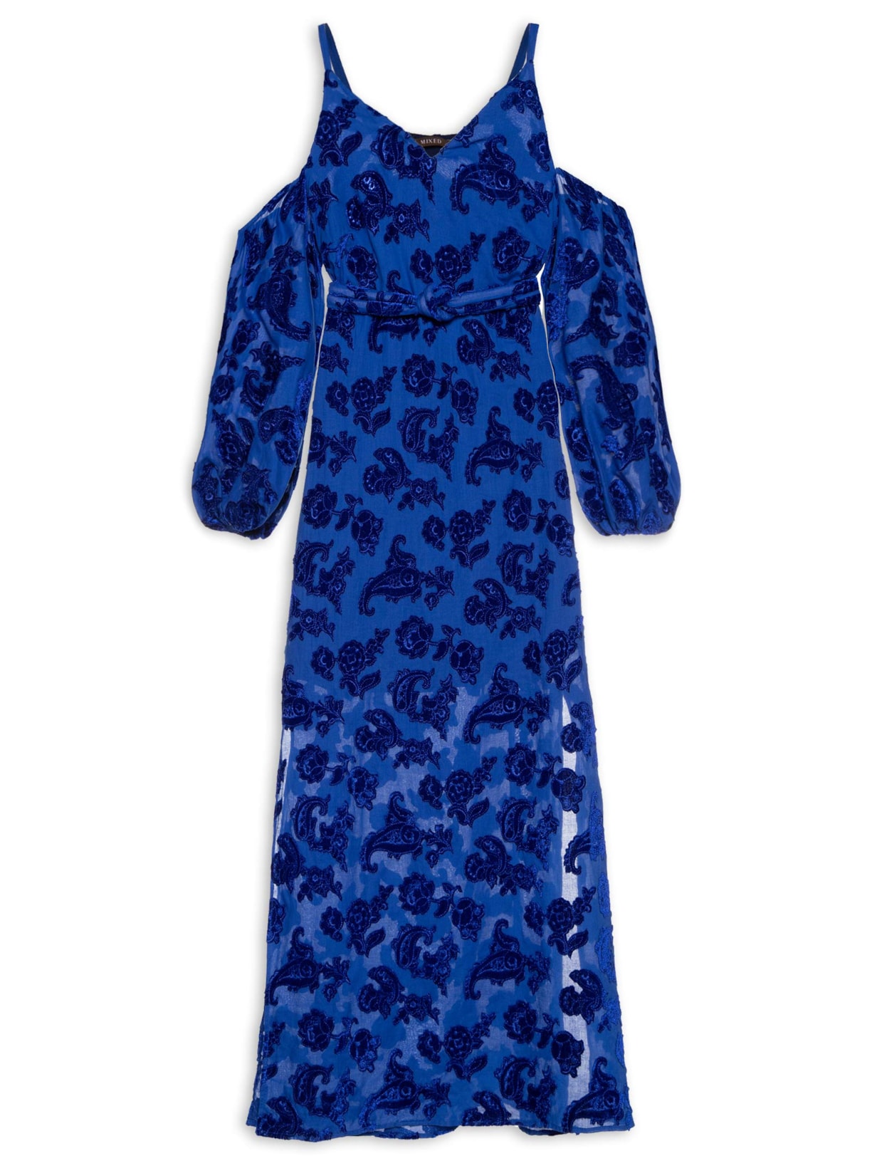 O vestido azul é confeccionado em tecido leve. A peça possui decote V, alças finas, cavas regulares, mangas 3/4 bufantes com elástico embutido nos punhos, pences frontais, fendas laterais, aplicação de bordados com formatos figurativos e superfície aveludada, forro, comprimento longo, shape solto, caimento reto e acabamento pespontado. Acompanha faixa na mesma cor e tecido para uso opcional.