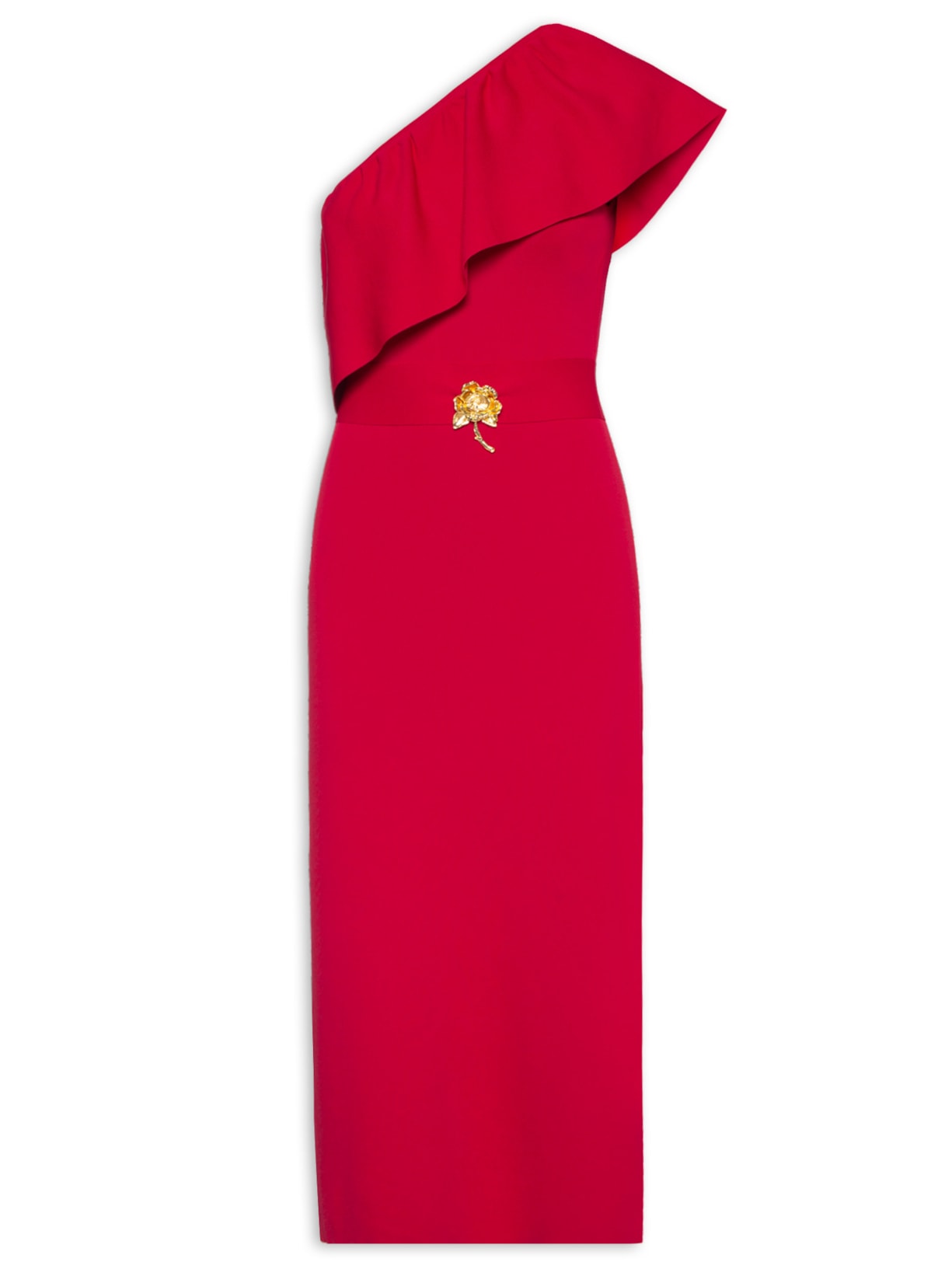 O vestido vermelho é confeccionado em malha com alta elasticidade. A peça justa na altura do busto e da cintura e solta no comprimento possui decote ombro único, sobreposição na altura do decote com babado, sem bojo, fenda lateral e comprimento midi. Acompanha cinto e broche para uso opcional em metal com formato figurativo de flor e acabamento polido.