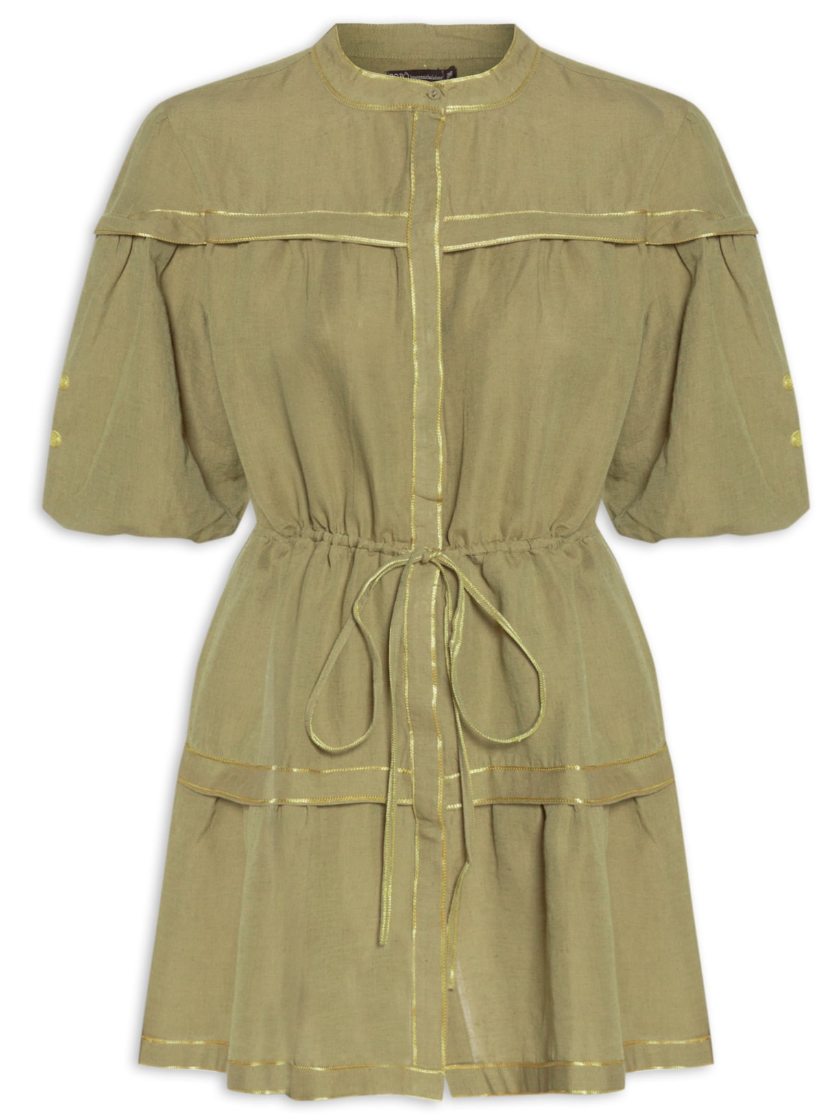 O vestido verde é confeccionado em linho misto sem elasticidade. A peça solta ao corpo possui decote redondo, mangas curtas bufantes com elástico embutido na barra e aplicação de bordado figurativo de flor em tom metalizado, recortes sobrepostos com acabamento bordado em tom metalizado, cordão alongado embutido na altura da cintura para ajuste e amarração, comprimento curto e fechamento frontal em botões com vista sobreposta.