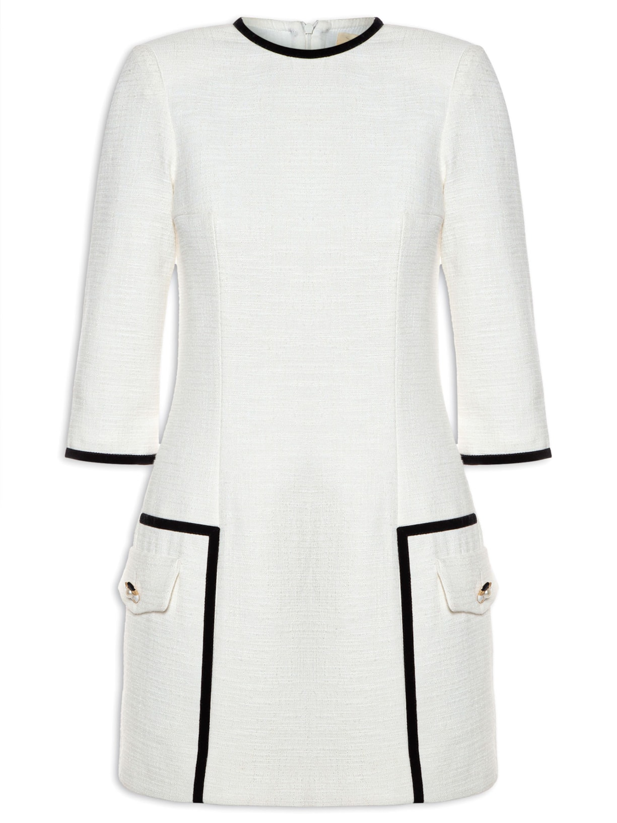 O vestido branco é confeccionado em tweed com toque de linho sem elasticidade. A peça solta ao corpo possui decote redondo, ombreiras embutidas, mangas curtas, recortes frontais com detalhes de viés de veludo em cor contrastante, abas decorativas com botões detalhados aplicados na parte frontal, decote e punhos com acabamento em viés de veludo em cor contrastante, forro, comprimento curto e fechamento posterior por zíper invisível.