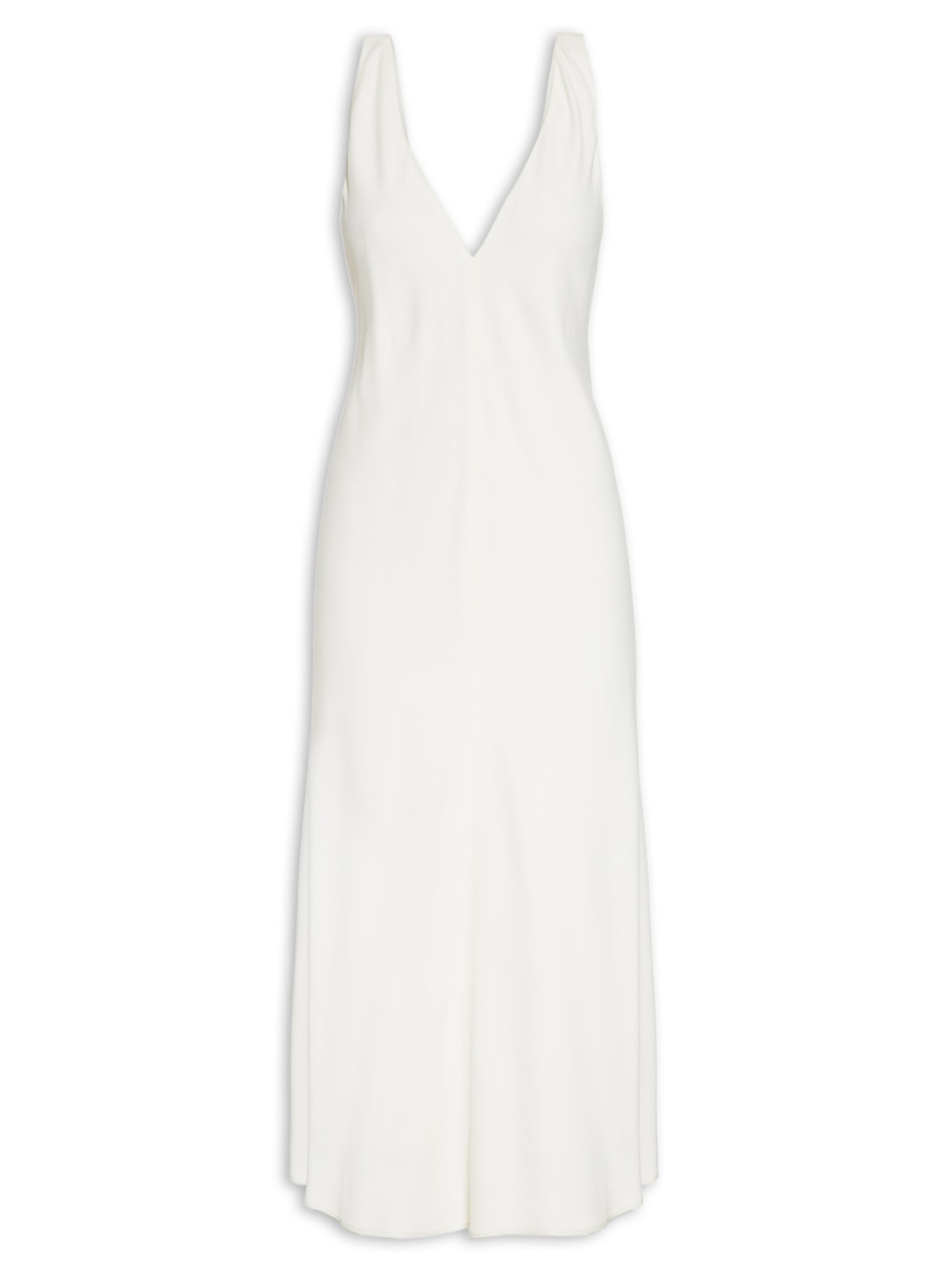 O vestido off white é confeccionado em tecido leve. A peça possui decote frontal V profundo, alças finas, cavas estendidas, recorte frontal, comprimento midi, shape solto e fechamento frontal por zíper invisível.
