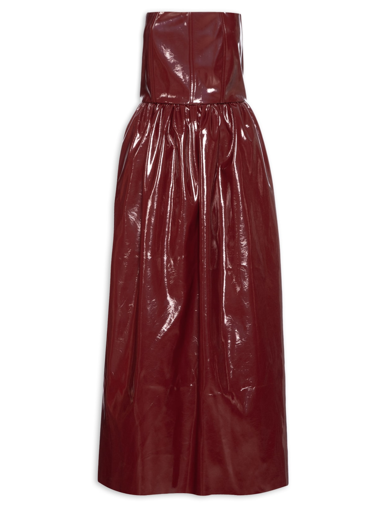 O vestido vinho é confeccionado em latex com superfície envernizada sem elasticidade. A peça justa ao busto e solta no comprimento de modelo tomara que caia possui decote reto, recortes frontais e posteriores, recorte na altura da cintura com efeito franzido, comprimento midi e fechamento posterior por zíper.