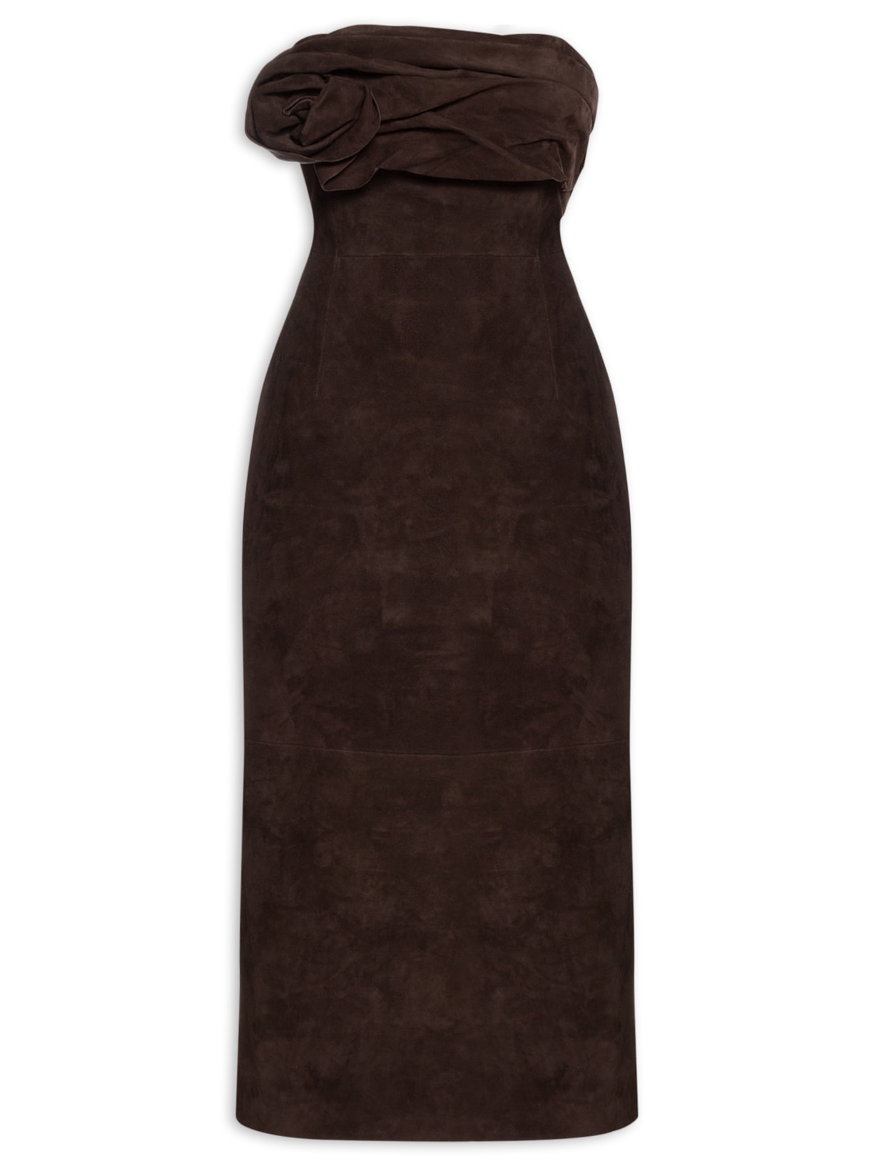 O vestido marrom é confeccionado em couro sem elasticidade. A peça de modelo tomara que caia justa na cintura e solta no comprimento possui decote reto, recorte posterior com fenda, pences posteriores, sobreposição posterior e frontal na altura do busto com assimetria, drapeado e detalhe com formato figurativo floral na parte frontal, recorte frontal, forro, sem bojo, meio forro em corset confeccionado em tule preto com barbatanas e fechamento posterior por colchetes, bolsos frontais embutidos na altura do quadril, comprimento midi e fechamento posterior por zíper invisível.