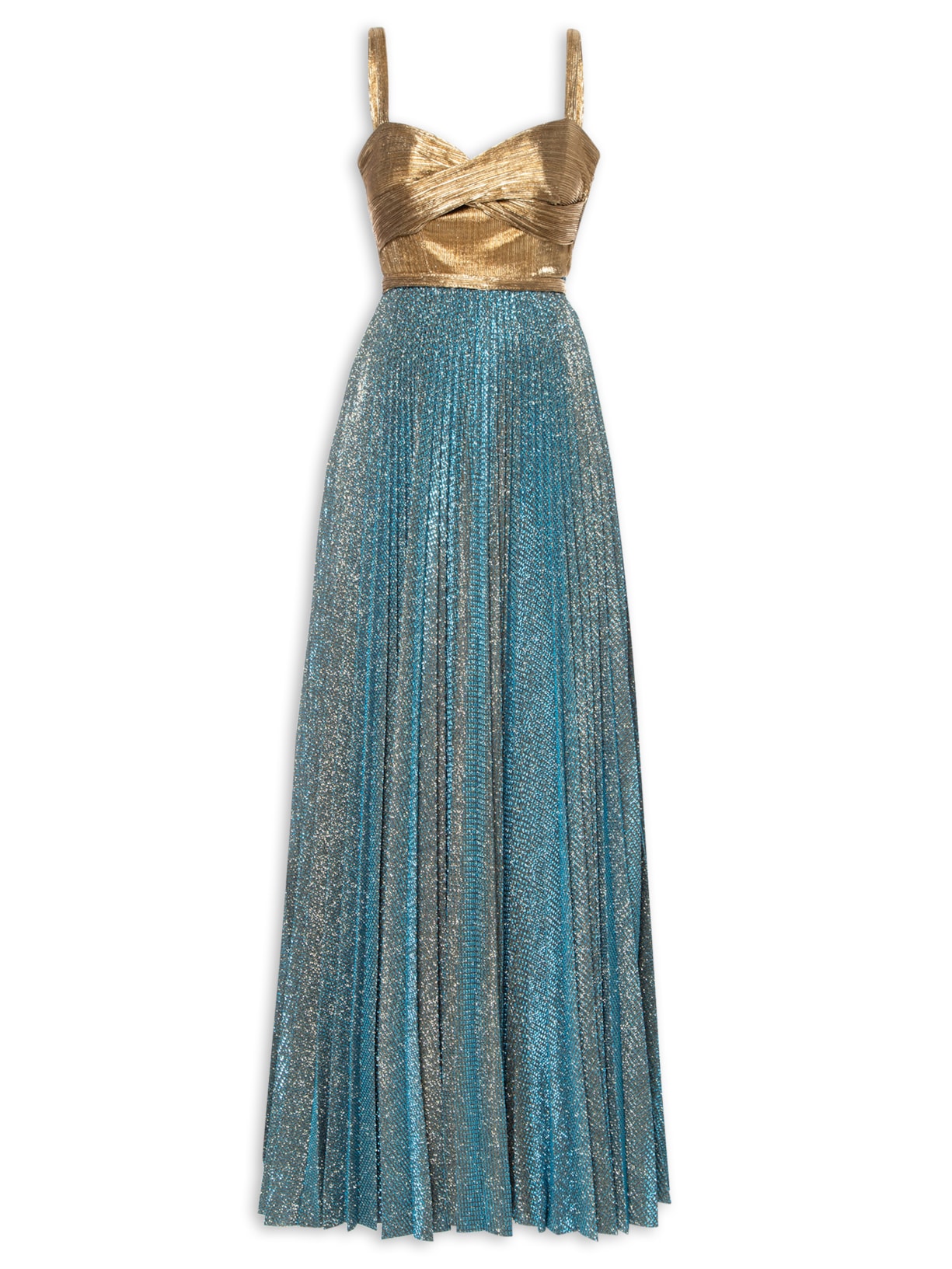 O vestido azul é confeccionado em malha com fios de lurex e baixa elasticidade. A peça justa na altura do busto e da cintura e solta no comprimento possui decote coração, alças médias, sem bojo, barbatanas embutidas na parte frontal na altura do busto e da cintura, parte superior dourada, detalhe de transpasse na altura do busto, saia plissada, comprimento longo e fechamento lateral por zíper.